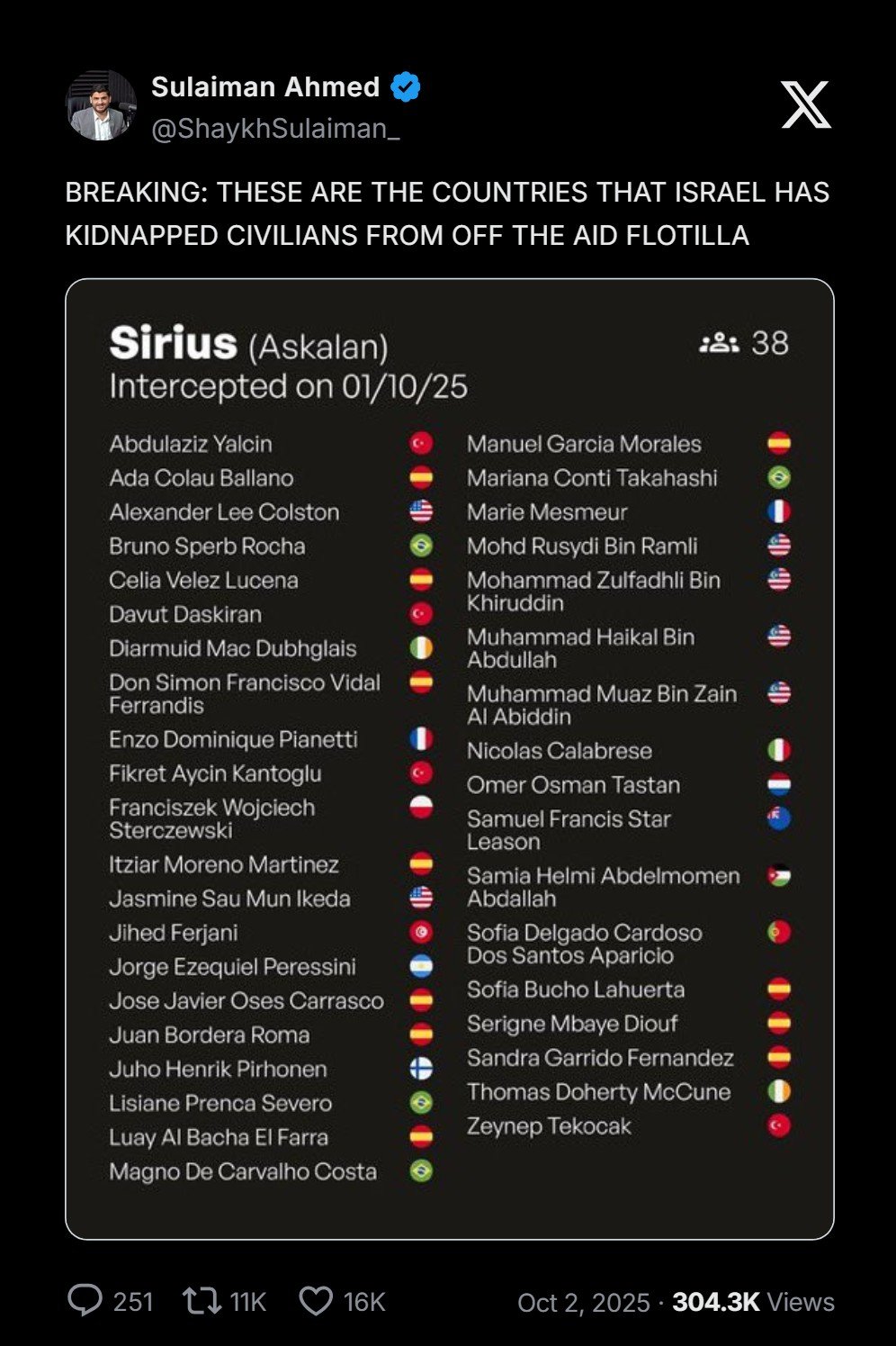 Pasukan Israel mencegat 13 kapal dalam Armada Global Sumud yang membawa relawan internasional menuju Gaza. Menurut juru bicara flotilla, Saif Abukeshek, ada lebih dari 200 aktivis dari 37 negara di kapal-kapal tersebut, termasuk dari Spanyol, Italia, Turki, dan Malaysia.