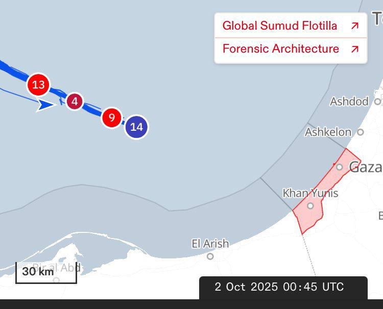 ✅30 kapal dari Armada Global Sumud masih berlayar dengan kuat dalam perjalanan untuk mengirimkan bantuan dan menerobos pengepungan di Gaza, hanya 46 mil laut jauhnya, meskipun adanya agresi yang tiada henti dari angkatan laut pendudukan Israel.