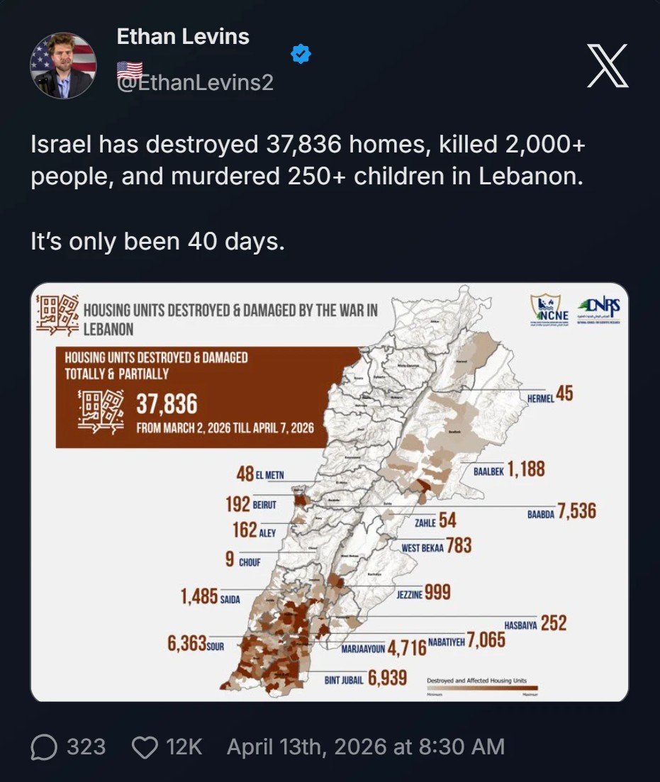 Israel has destroyed 37,836 homes, killed 2,000+ people, and murdered 250+ children in Lebanon.