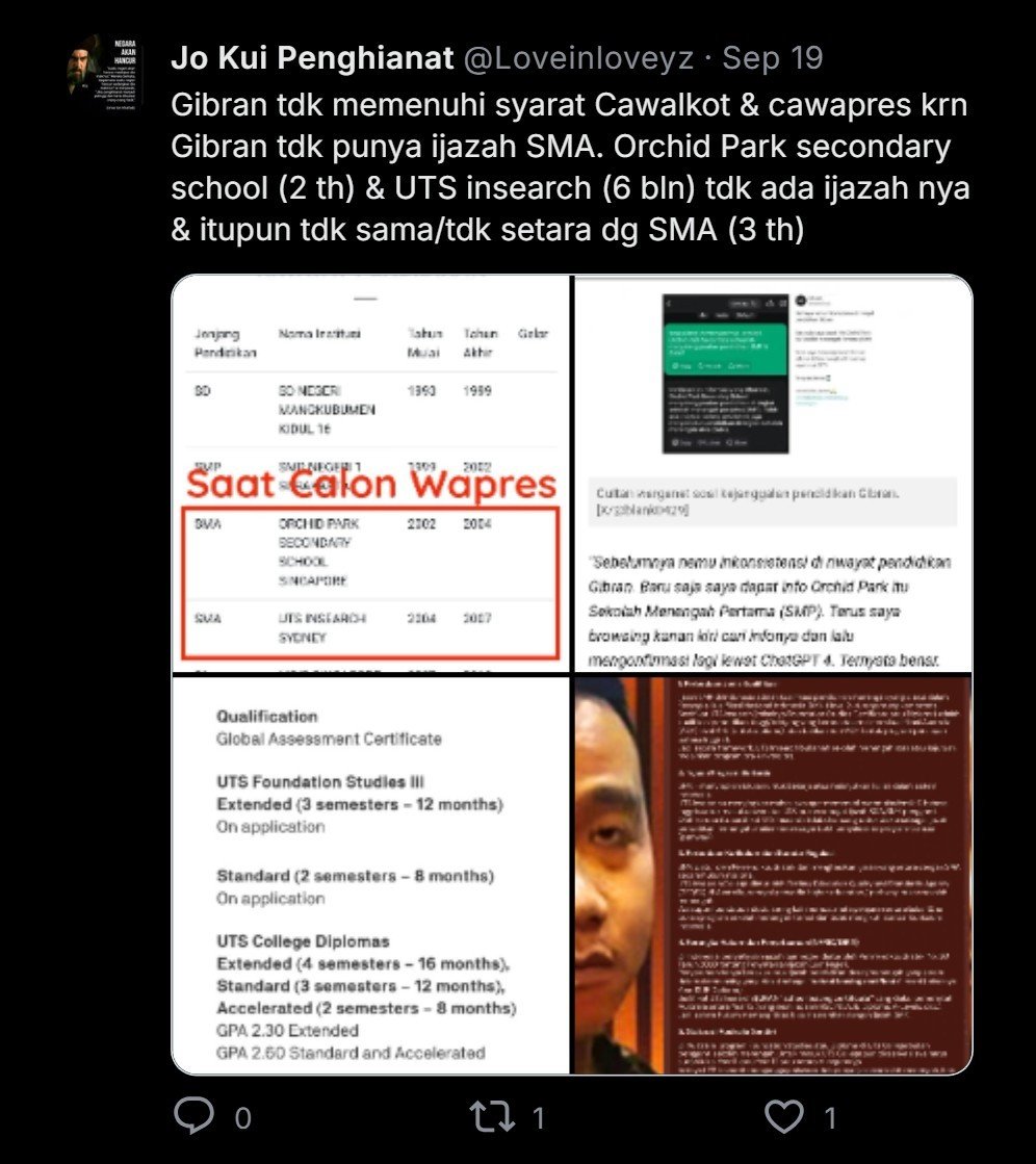 “Gibran tidak memenuhi syarat Cawalkot & Cawapres karena Gibran tidak punya ijazah SMA. Orchid Park secondary school (2 tahun) & UTS insearch (6 bulan) tidak ada ijazah nya & itupun tdk sama/tdk setara dg SMA (3 th),” ujar netizen X.