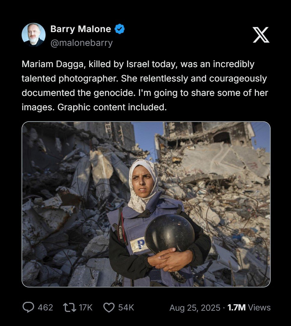 Jurnalis Palestina Mariam Abu Daqqa (Mariam Dagga) gugur syahid pada Senin (25/8/2025) dalam serangan ‘Israel’ yang disengaja dan disiarkan langsung ke Rumah Sakit Nasser di Gaza selatan. Dalam tragedi itu, ia gugur bersama empat rekannya sesama jurnalis dan 15 orang lainnya.