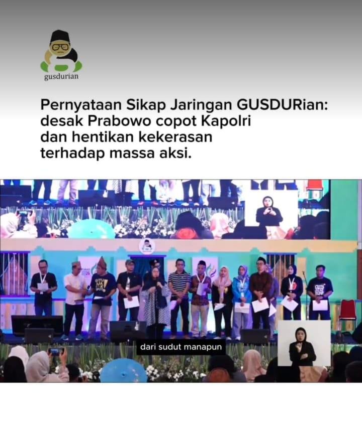 Jaringan GUSDURian mendesak Presiden Prabowo Subianto mencopot Jenderal Listyo Sigit Prabowo sebagai Kepala Kepolisian Republik Indonesia (Kapolri) dan menghentikan kekerasan terhadap massa aksi.