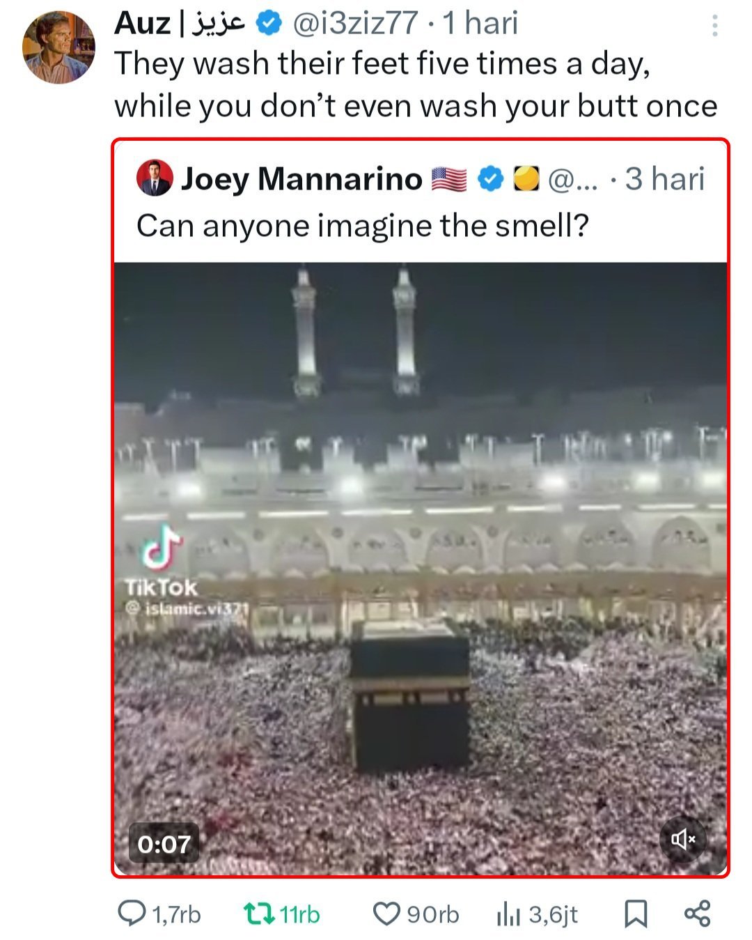 Jadi ada warga AS @JoeyMannarino yang mengomentari jutaan/ratusan ribu jamaah umroh yang sedang Tawaf (mengelilingi Ka’bah di Masjidil Haram, Makkah, sebanyak tujuh kali putaran), lalu dia mengejek gimana baunya (bau badannya/keringet dll).