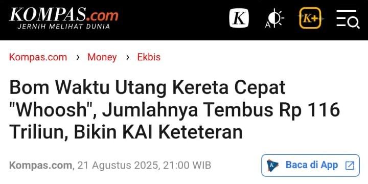 Utang proyek Kereta Cepat Jakarta-Bandung (KCJB) atau Whoosh kian membengkak hingga menembus Rp 116 triliun atau sekitar 7,2 miliar dollar AS. Beban itu membuat PT Kereta Api Indonesia (KAI) dan konsorsium BUMN yang terlibat kewalahan menanggung kerugian.
