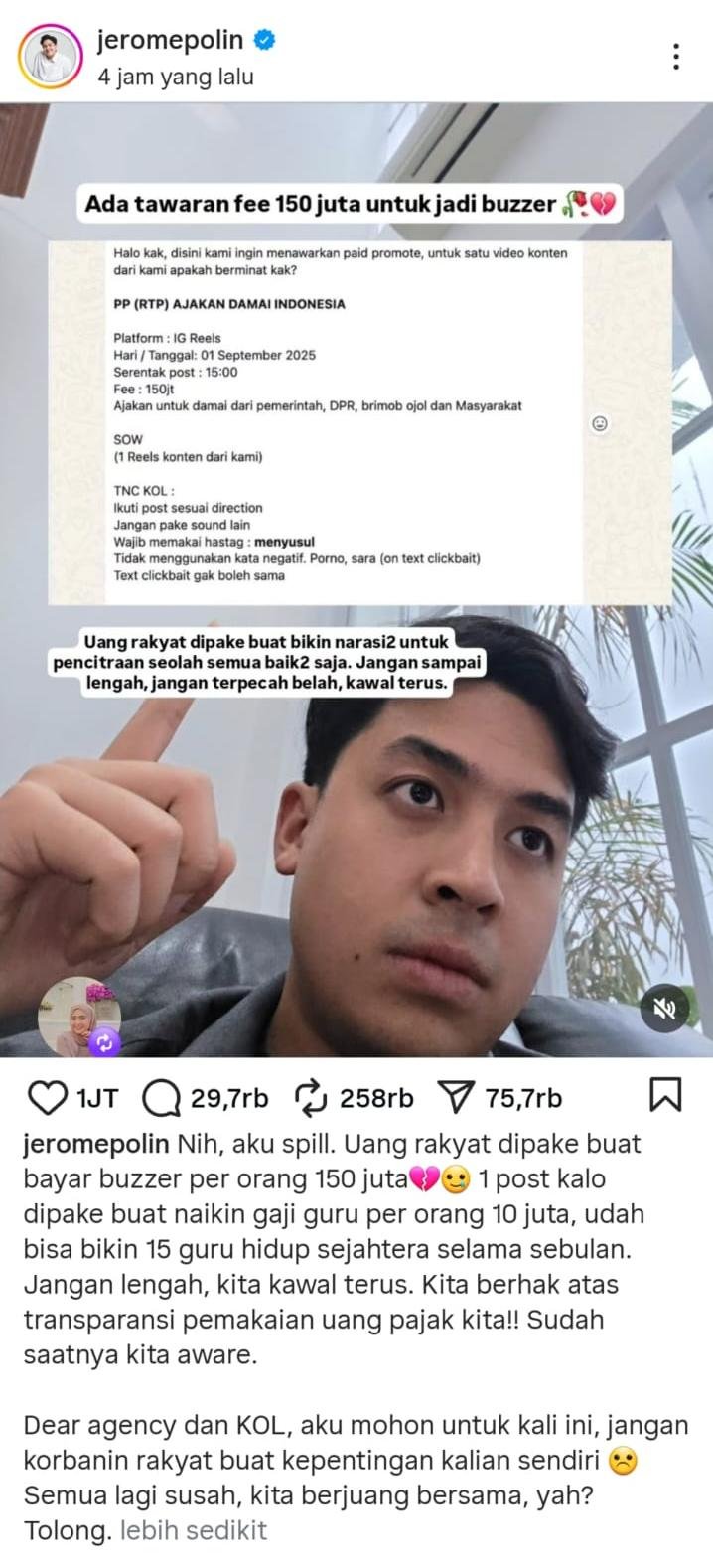 Melalui unggahan di akun Instagramnya yang memiliki 9 juta followers, Jerome membagikan tangkapan layar percakapan (chat) yang memperlihatkan adanya tawaran bagi dirinya untuk menjadi buzzer politik dengan bayaran fantastis Rp 150 juta !!!