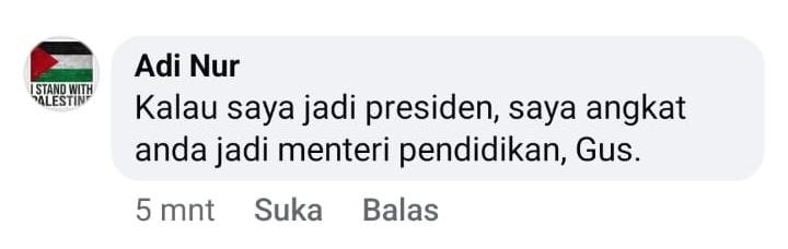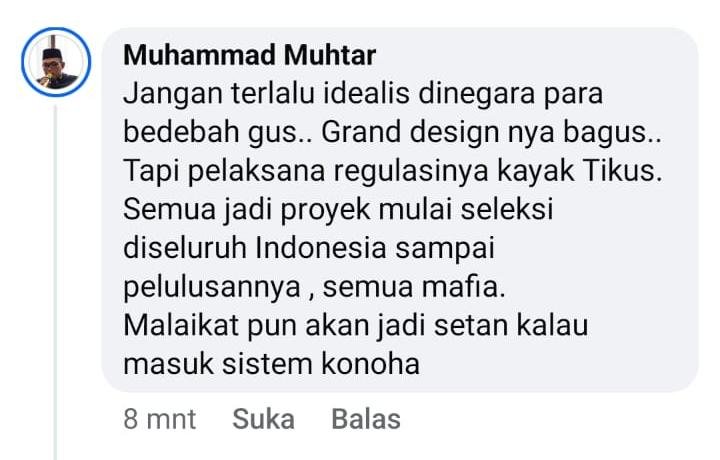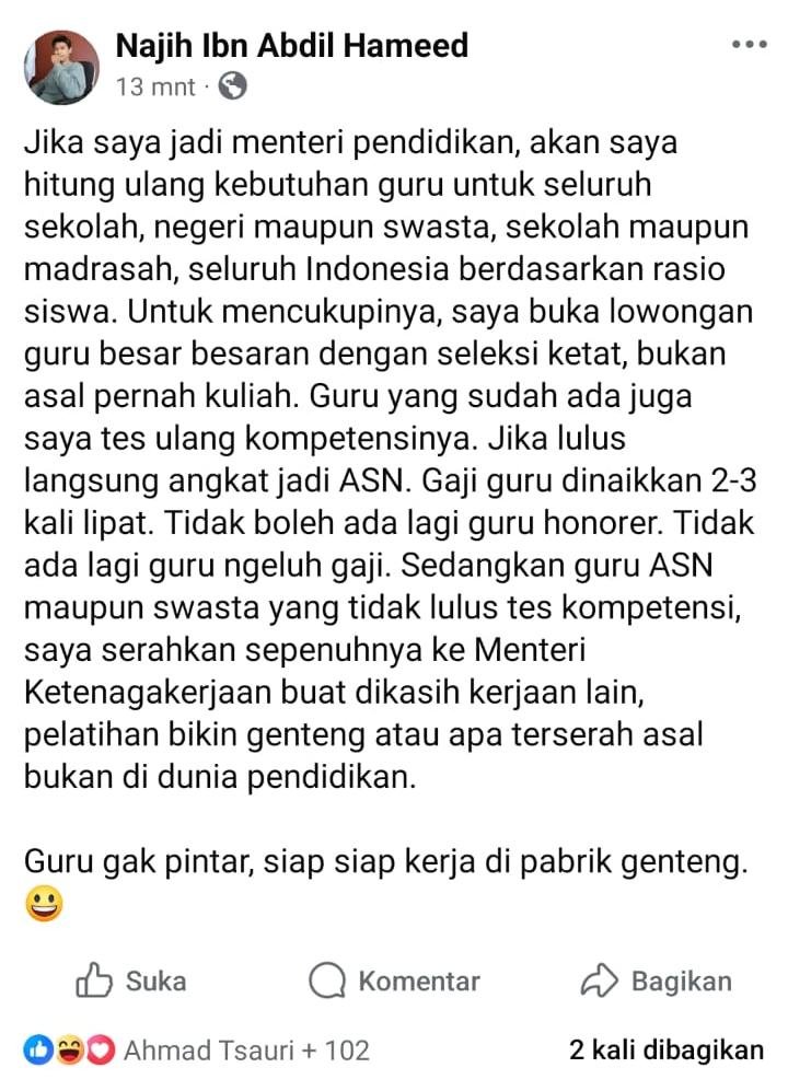 Jika saya jadi menteri pendidikan, akan saya hitung ulang kebutuhan guru untuk seluruh sekolah, negeri maupun swasta, sekolah maupun madrasah, seluruh Indonesia berdasarkan rasio siswa. Untuk mencukupinya, saya buka lowongan guru besar besaran dengan seleksi ketat, bukan asal pernah kuliah. Guru yang sudah ada juga saya tes ulang kompetensinya. Jika lulus langsung angkat jadi ASN. Gaji guru dinaikkan 2-3 kali lipat. Tidak boleh ada lagi guru honorer. Tidak ada lagi guru ngeluh gaji. Sedangkan guru ASN maupun swasta yang tidak lulus tes kompetensi, saya serahkan sepenuhnya ke Menteri Ketenagakerjaan buat dikasih kerjaan lain, pelatihan bikin genteng atau apa terserah asal bukan di dunia pendidikan.