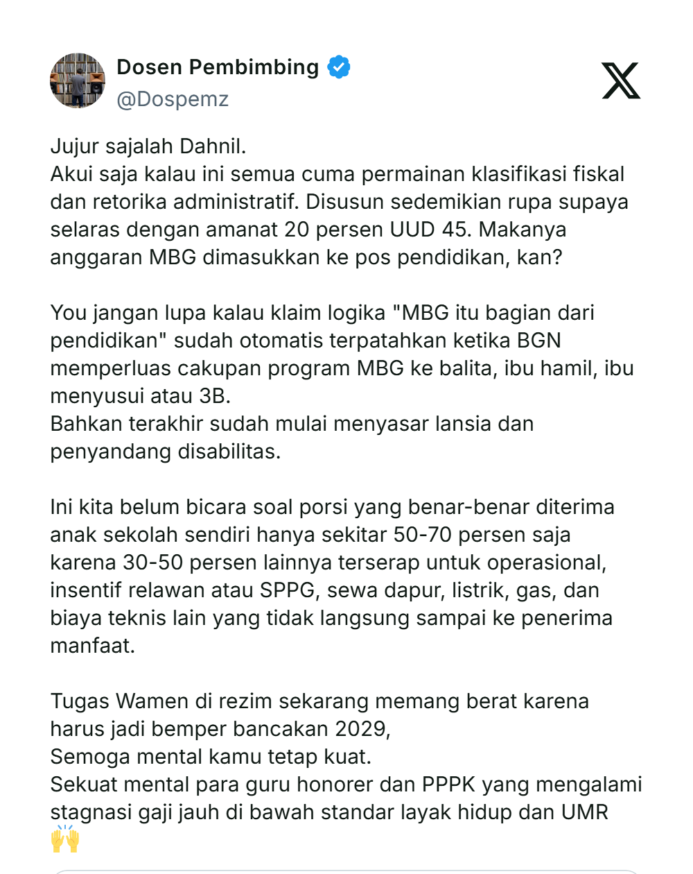 Akui saja kalau ini semua cuma permainan klasifikasi fiskal dan retorika administratif. Disusun sedemikian rupa supaya selaras dengan amanat 20 persen UUD 45. Makanya anggaran MBG dimasukkan ke pos pendidikan, kan?