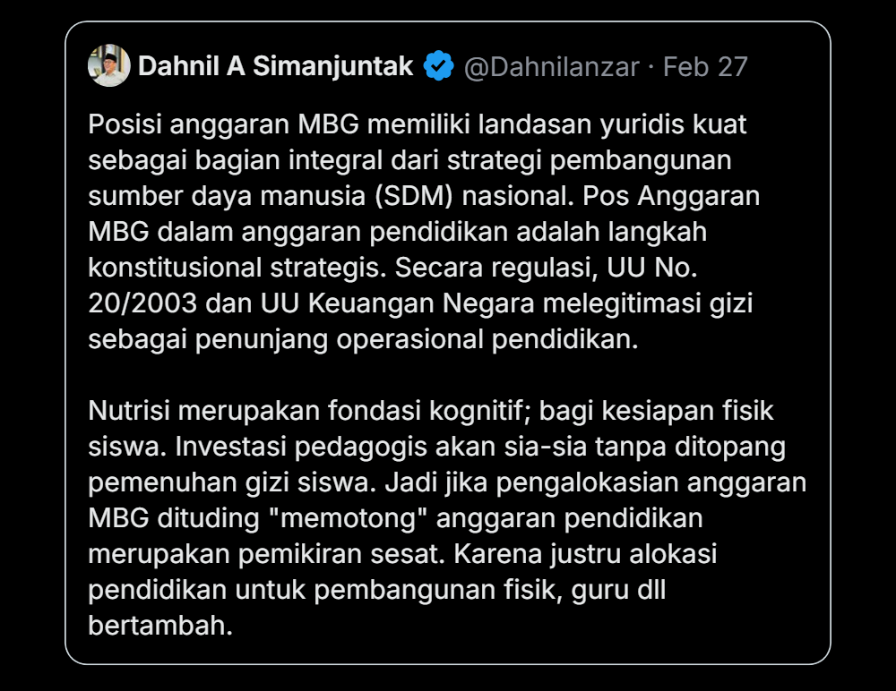 Akui saja kalau ini semua cuma permainan klasifikasi fiskal dan retorika administratif. Disusun sedemikian rupa supaya selaras dengan amanat 20 persen UUD 45. Makanya anggaran MBG dimasukkan ke pos pendidikan, kan?