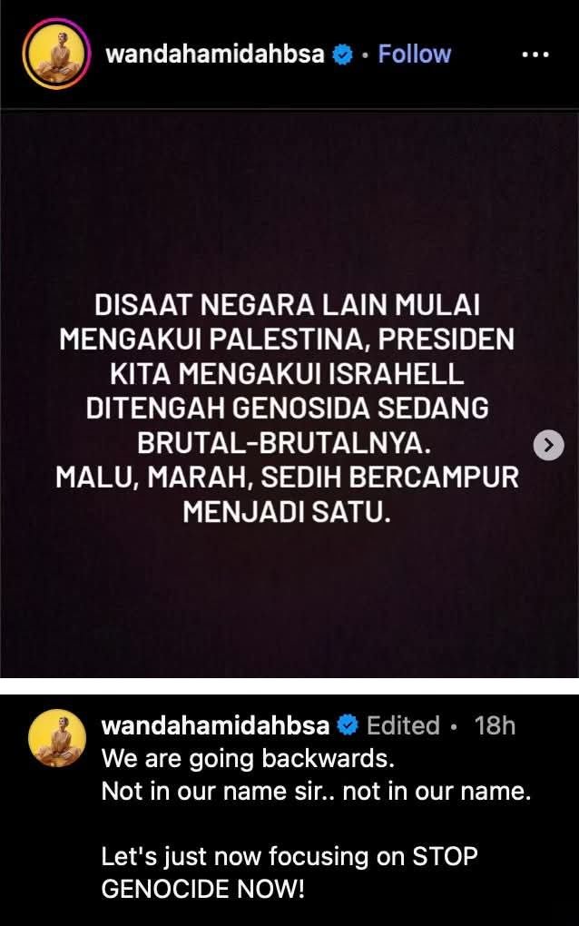 Di atas adalah postingan Wanda Hamidah menanggapi pidato Presiden Prabowo di PBB yang menyatakan Indonesia akan mengakui negara Israel jika israel mengakui negara Palestina.