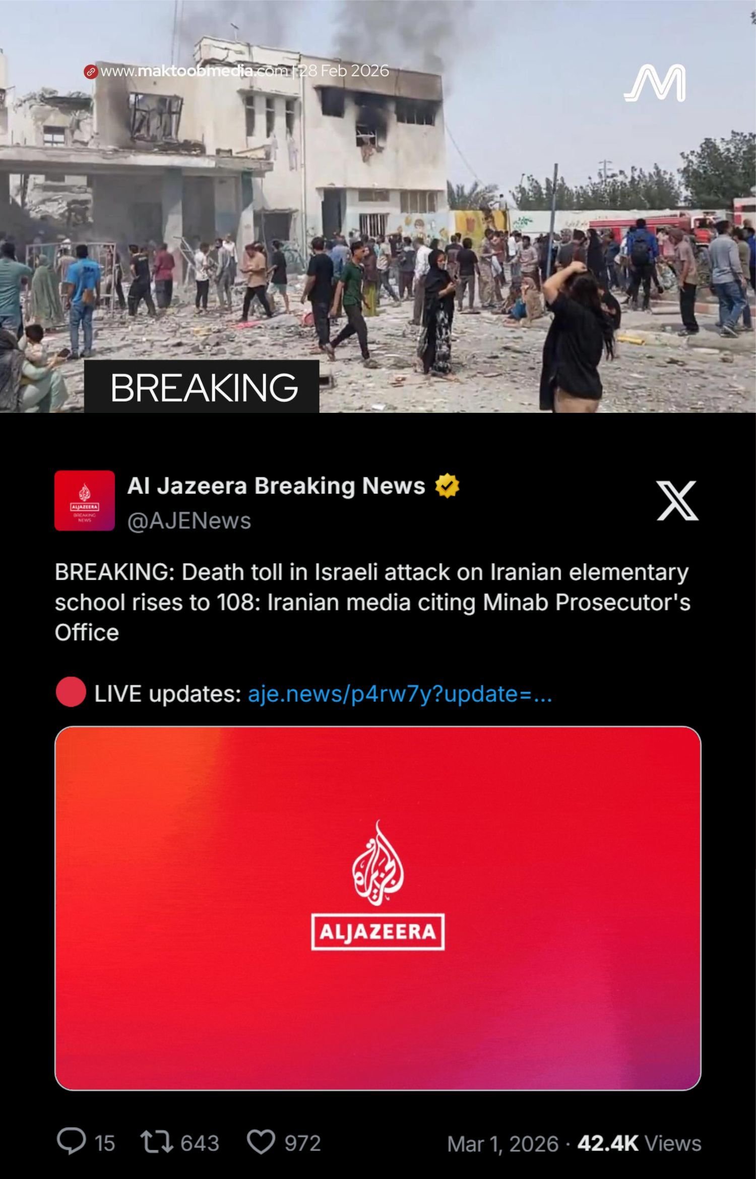 Laporan terkini menyebutkan bahwa serangan udara yang dilakukan oleh Israel dan Amerika Serikat terhadap sebuah sekolah dasar (SD) perempuan di Minab, Provinsi Hormozgan, Iran, pada Sabtu, 28 Februari 2026, telah menewaskan sedikitnya 108 orang.