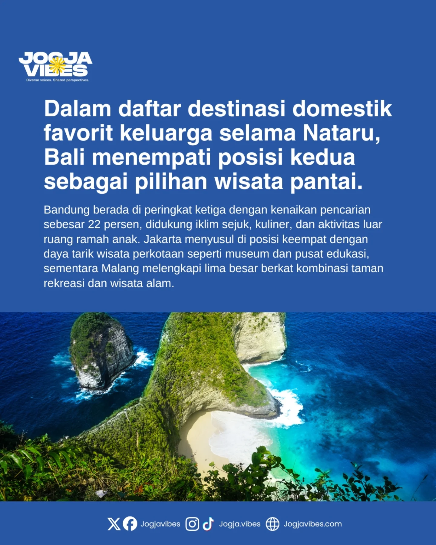 Yogyakarta menjadi destinasi domestik paling diminati, disusul Bandung, Bali, dan Jakarta.