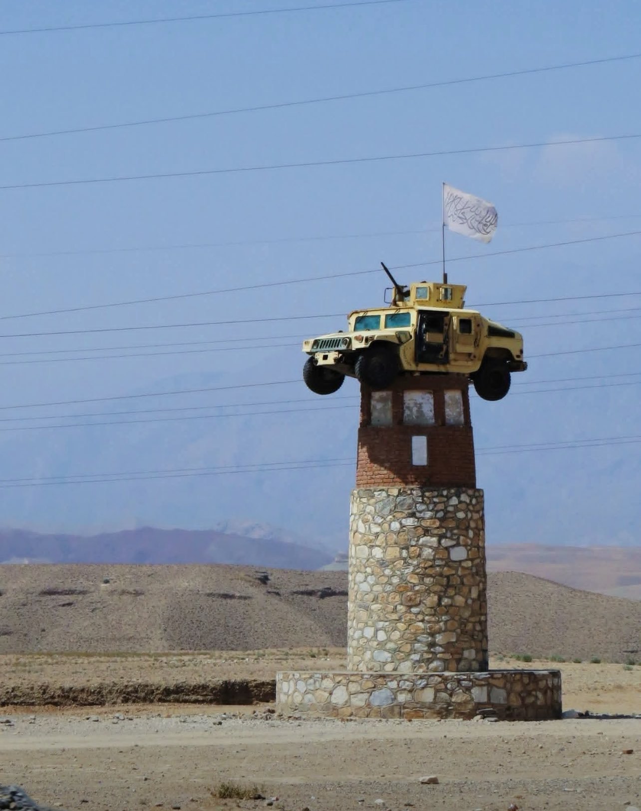 *Foto: bangkai kendaraan Humvee pasukan AS yang dipasang di atas menara batu, simbol kekalahan AS di Afghanistan melawan Taliban.
