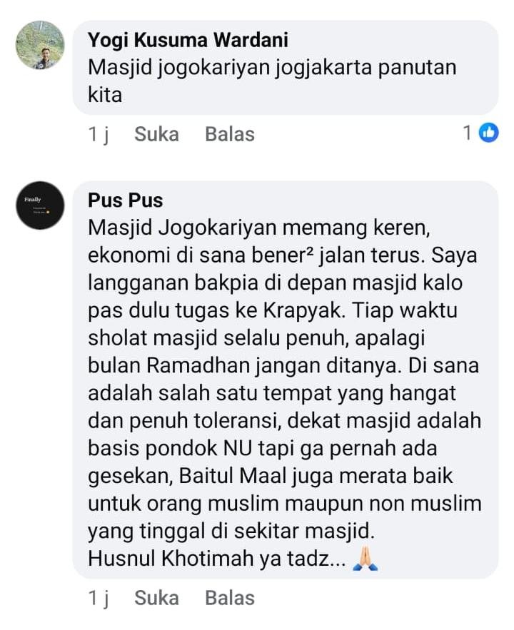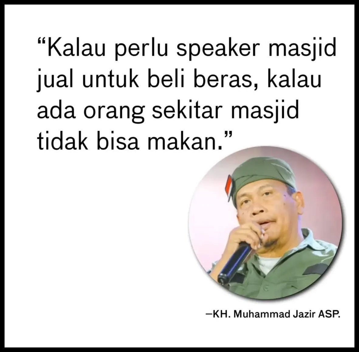 “Kalau semua pemuka agama seperti Pak ustaz ini, sebagian besar masalah Indonesia terselesaikan dengan cepat. Semua Sumber daya dikerahkan untuk membantu yang kekurangan. Turut berdukacita atas berpulangnya Ustaz Muhammad Jazir. Konsepnya dalam mengelola Masjid jadi panutan banyak orang.”