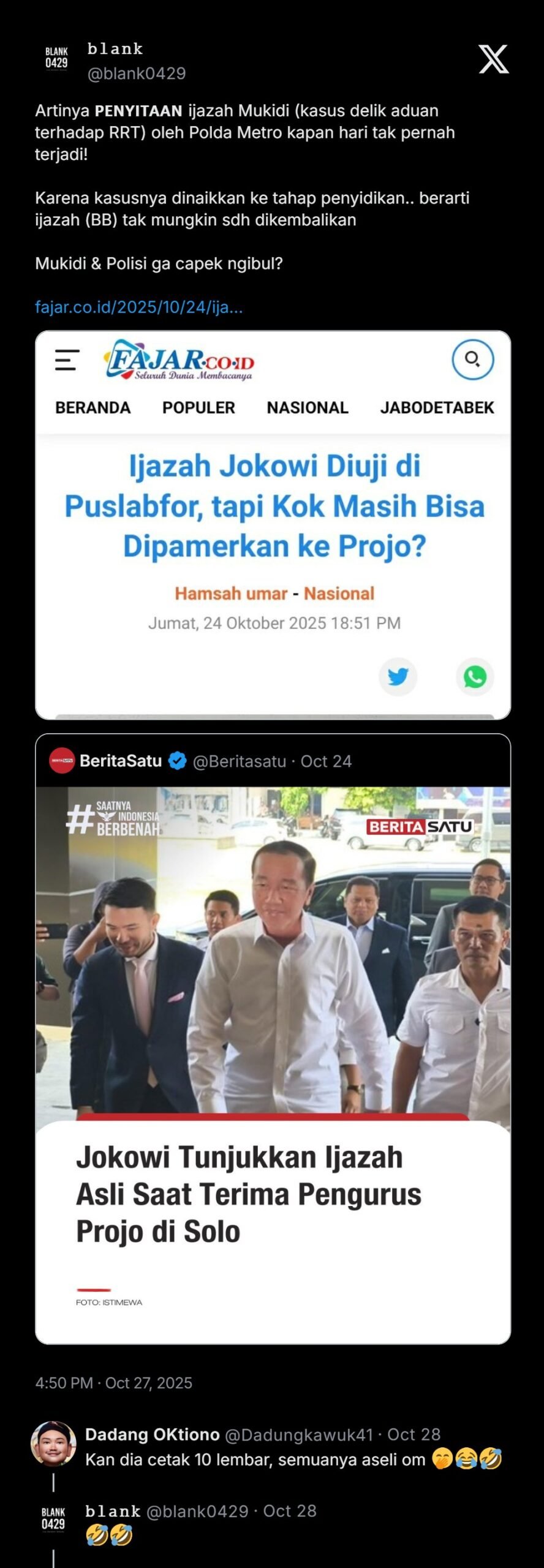 “Artinya 𝗣𝗘𝗡𝗬𝗜𝗧𝗔𝗔𝗡 ijazah Mukidi (kasus delik aduan terhadap RRT) oleh Polda Metro kapan hari tak pernah terjadi! Karena kasusnya dinaikkan ke tahap penyidikan.. berarti ijazah (Barang Bukti) tak mungkin sudah dikembalikan. Mukidi & Polisi ga capek ngibul?” ujar akun X @blank0429.
