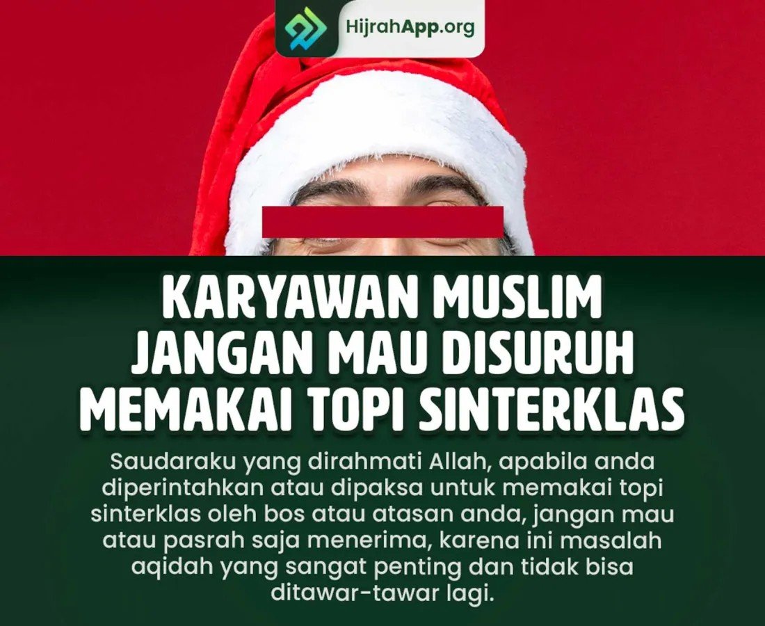 Saudaraku yang dirahmati Allah, apabila anda diperintahkan atau dipaksa untuk memakai topi sinterklas oleh bos atau atasan anda, jangan mau atau pasrah saja menerima, karena ini masalah aqidah yang sangat penting dan tidak bisa ditawar-tawar lagi.