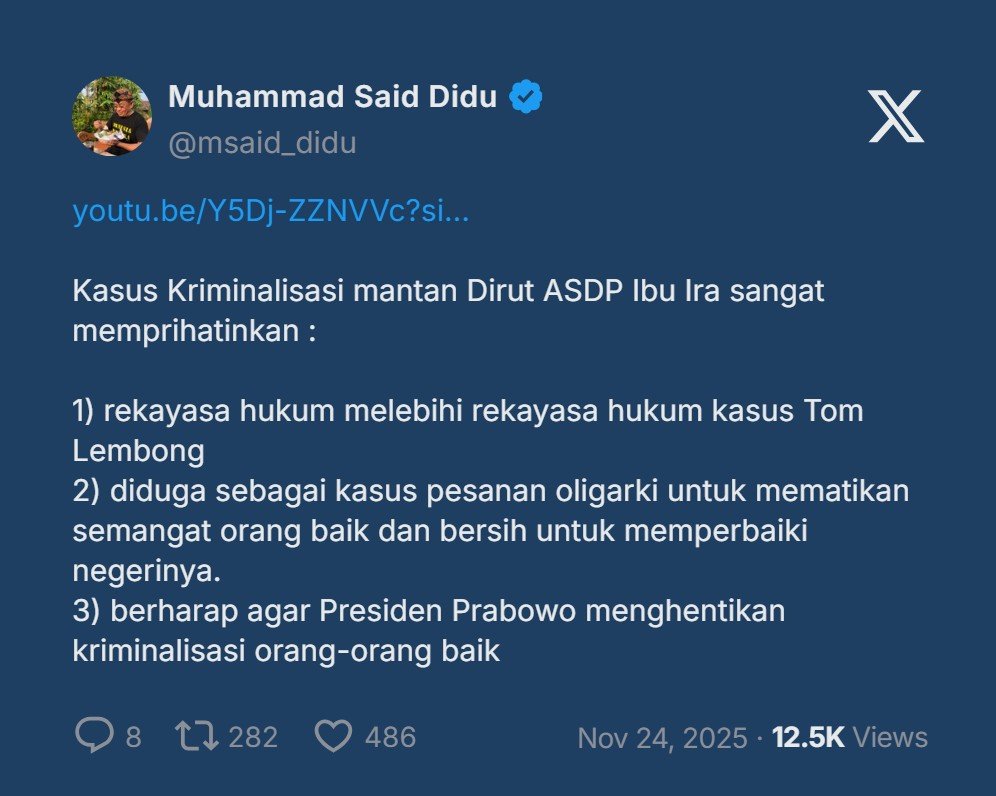 Said Didu mengatakan Kasus Kriminalisasi mantan Dirut ASDP Ibu Ira sangat memprihatinkan :