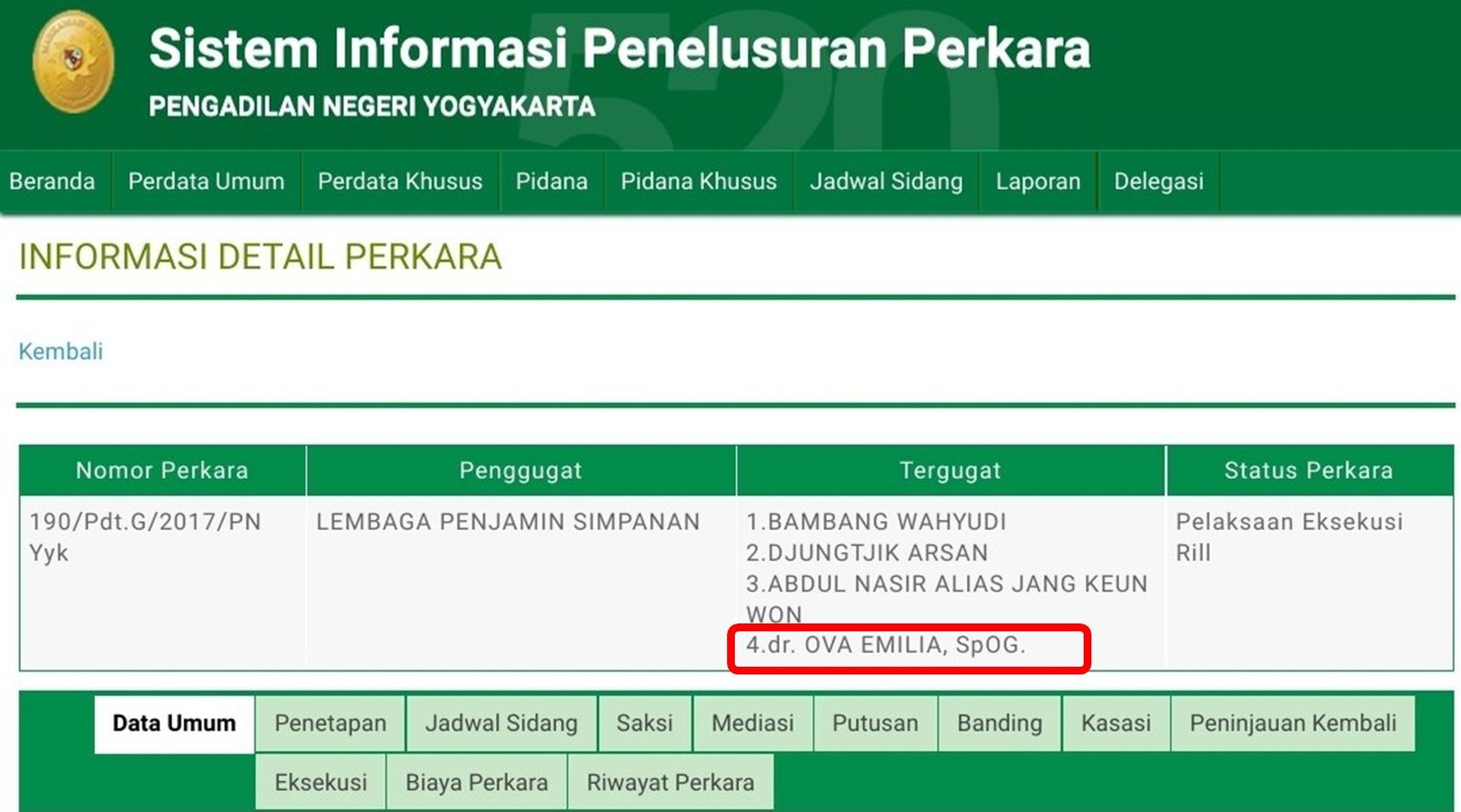 Kasus yang dimaksud adalah gugatan perdata LPS terhadap Ova Emilia dan suaminya (Jang Keun Wong/Abdul Nasir) pada 2022 terkait kegagalan BPR Tripilar Athajaya, dengan tuntutan Rp29 miliar lebih.