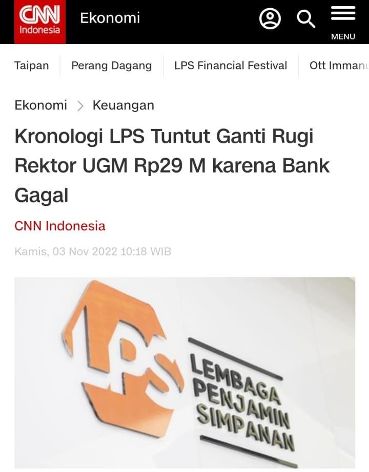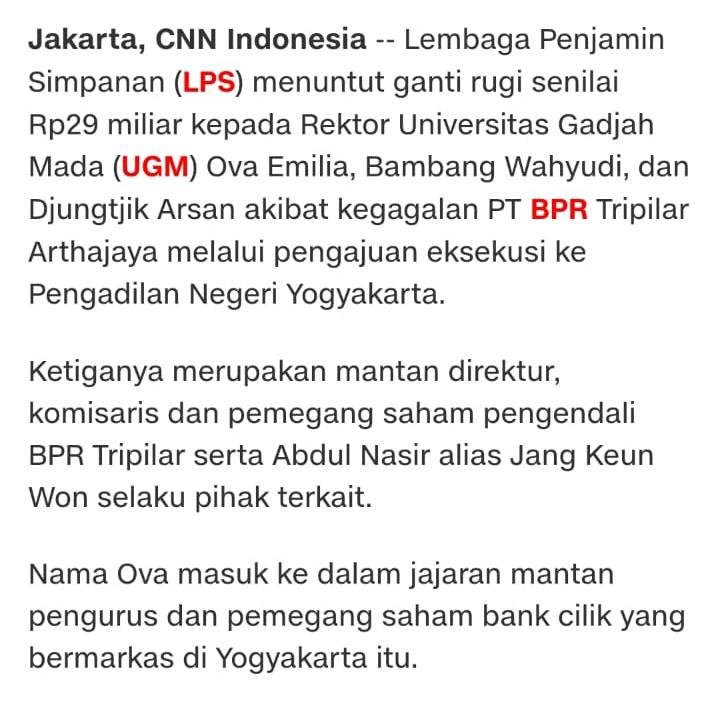 Lembaga Penjamin Simpanan (LPS) menuntut ganti rugi senilai Rp29 miliar kepada Rektor Universitas Gadjah Mada (UGM) Ova Emilia, Bambang Wahyudi, dan Djungtjik Arsan akibat kegagalan PT BPR Tripilar Arthajaya melalui pengajuan eksekusi ke Pengadilan Negeri Yogyakarta.