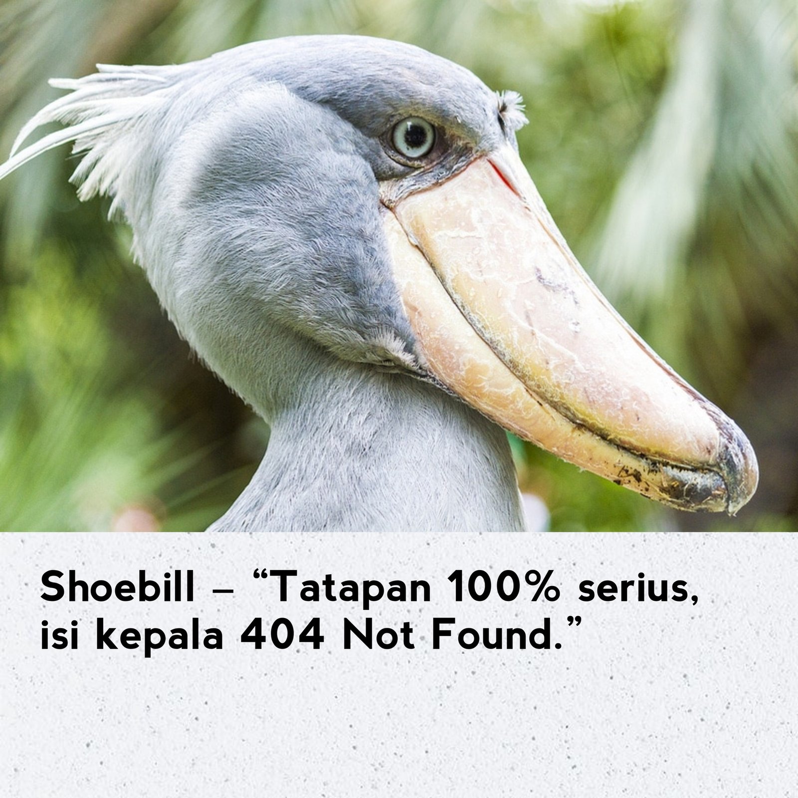Burung ini kelihatan seperti sedang mempertanyakan hidup 24 jam sehari. Tatapan kosong, kepala besar, dan paruh yang bentuknya kayak sepatu kayu nenek-nenek Belanda—itulah Shoebill, penghuni rawa-rawa Afrika Timur yang terkenal dengan resting annoyed face-nya.