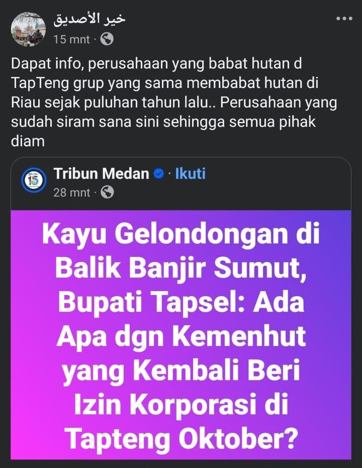 “Tapi pada sekitar awal November (kerja sama korporasi dengan masyarakat) kembali beroperasi. Lalu 25 November banjir bandang terjadi di Batangtoru,” ungkap Gus Irawan.