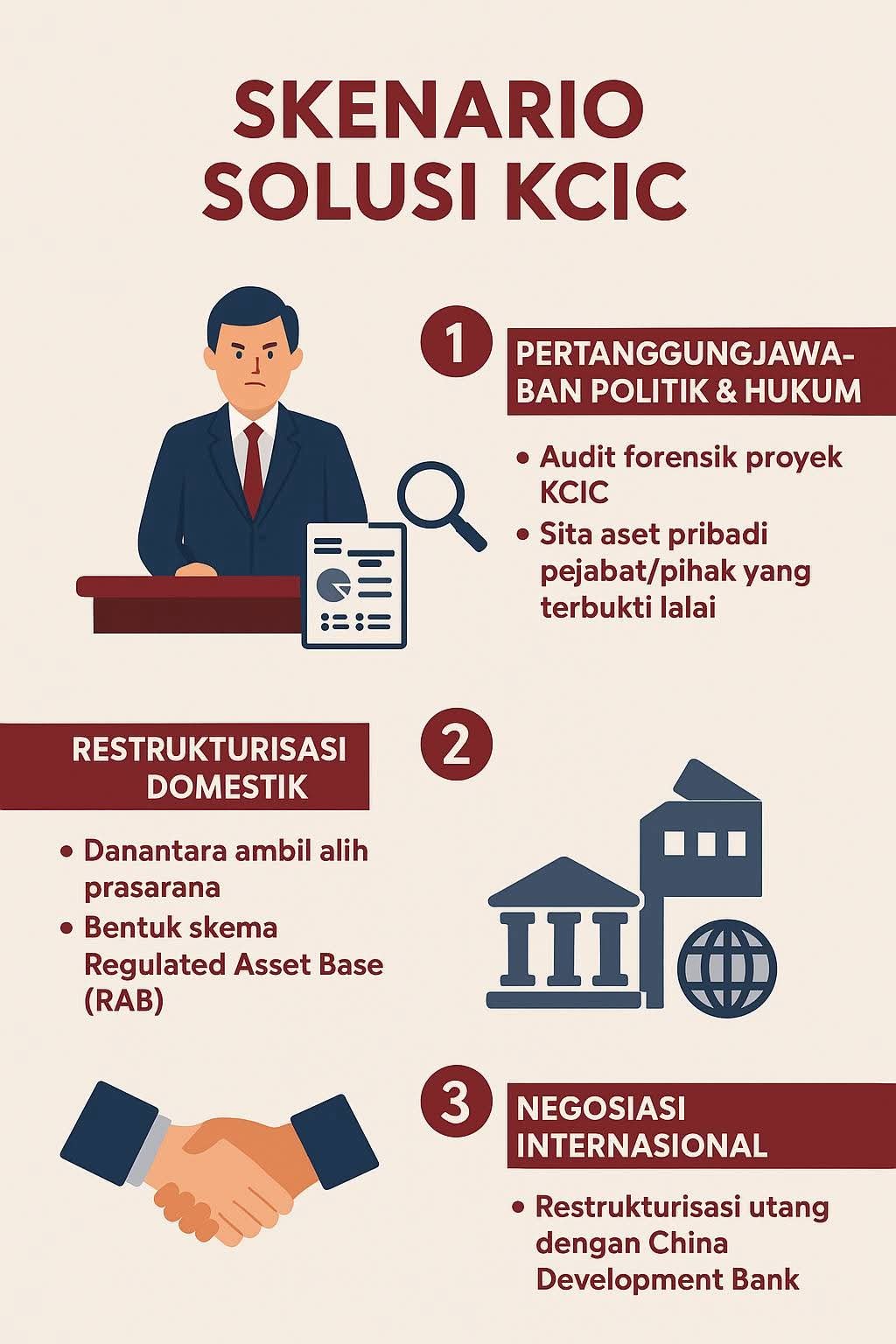 Baru setelah itu, bicara solusi ekonomi. Restrukturisasi dengan CDB mutlak. Negosiasi: tenor panjang, bunga rendah, grace period diperluas. Lalu pisahkan prasarana dan operasi. Biar Danantara jadi InfraCo, fokus pada aset dan pembiayaan. KCIC jadi OpCo, fokus pada penumpang. Sehingga risiko lebih terkendali.