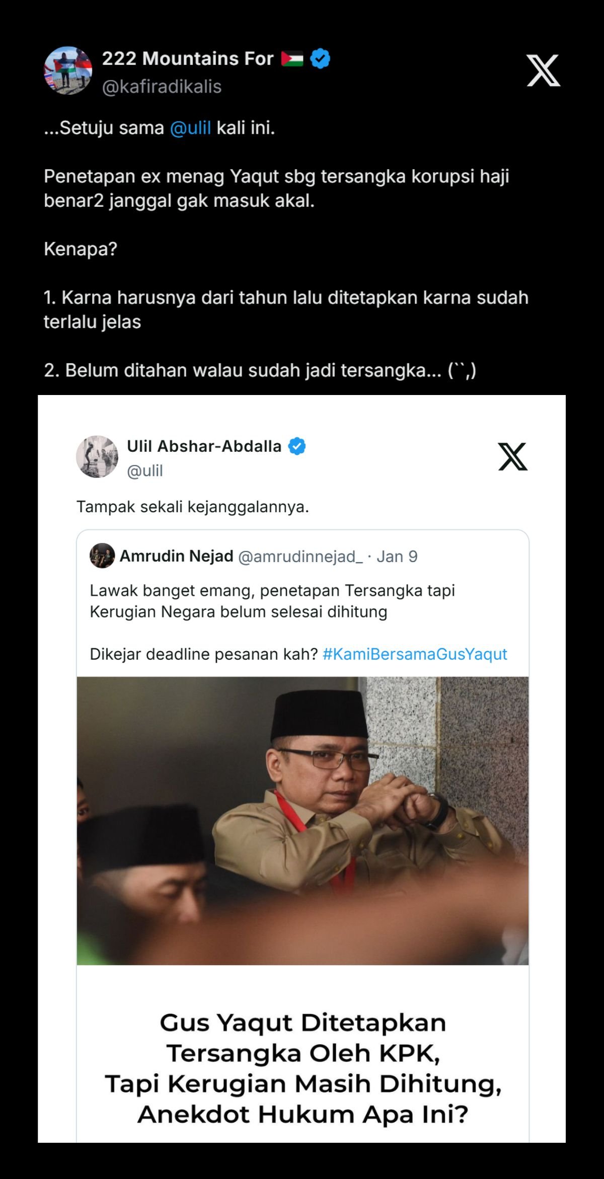 “Lawak banget emang, penetapan Tersangka tapi Kerugian Negara belum selesai dihitung. Dikejar deadline pesanan kah? #KamiBersamaGusYaqut,” kata pendukung Yaqut akun X Amrudin Nejad @amrudinnejad_.
