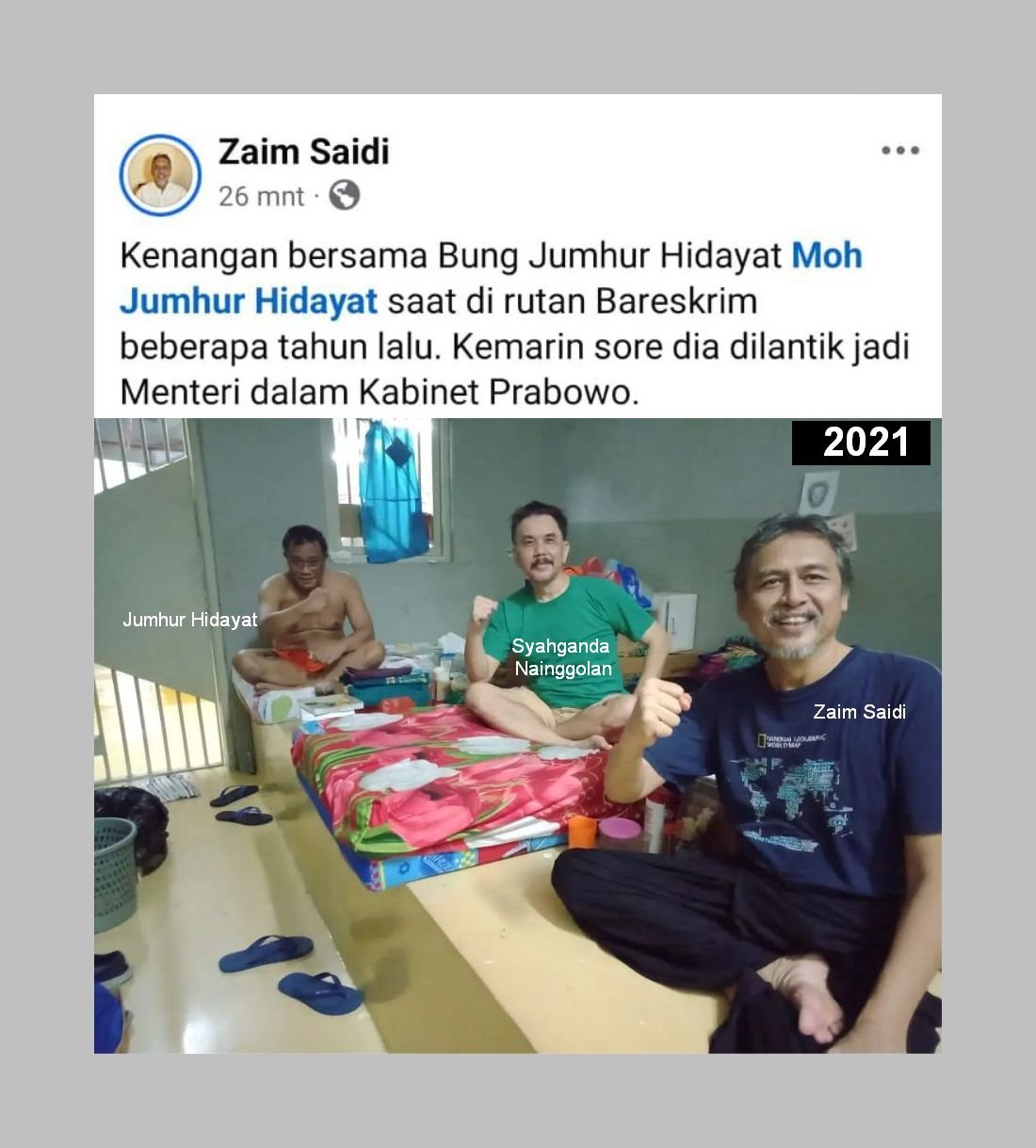 Kenangan bersama Bung Jumhur Hidayat saat di rutan Bareskrim beberapa tahun lalu. Kemarin sore dia dilantik jadi Menteri dalam Kabinet Prabowo.
