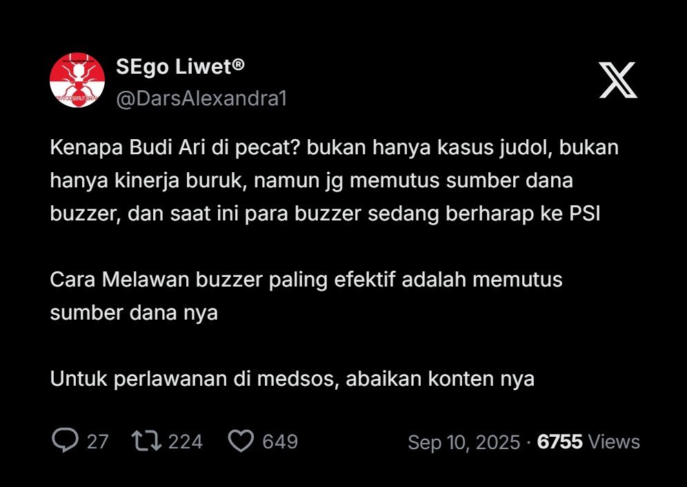 “Kenapa Budi Ari dipecat? bukan hanya kasus judol, bukan hanya kinerja buruk, namun jg memutus sumber dana buzzer, dan saat ini para buzzer sedang berharap ke PSI