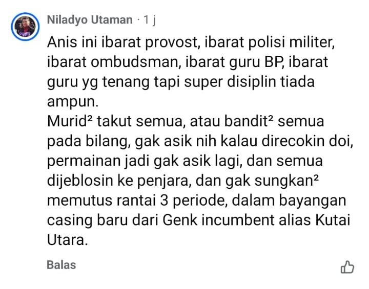 “Anies ini ibarat provost, ibarat polisi militer, ibarat ombudsman, ibarat guru BP, ibarat guru yg tenang tapi super disiplin tiada ampun. Murid² takut semua, atau bandit² semua pada bilang, gak asik nih kalau direcokin doi, permainan jadi gak asik lagi, dan semua dijeblosin ke penjara, dan gak sungkan² memutus rantai 3 periode, dalam bayangan casing baru dari Genk incumbent alias Kutai Utara.” (Niladyo Utaman)