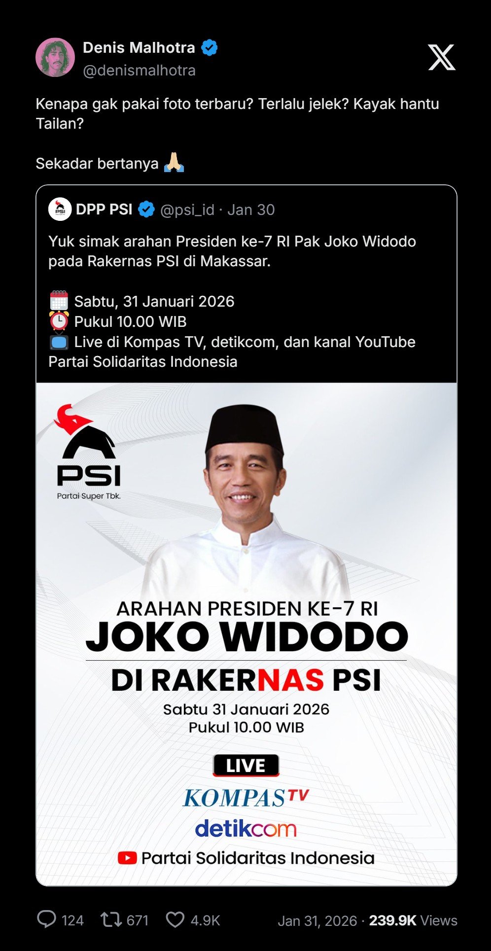 “Yuk simak arahan Presiden ke-7 RI Pak Joko Widodo pada Rakernas PSI di Makassar. 🗓 Sabtu, 31 Januari 2026 ⏰ Pukul 10.00 WIB,” posting akun X PSI.