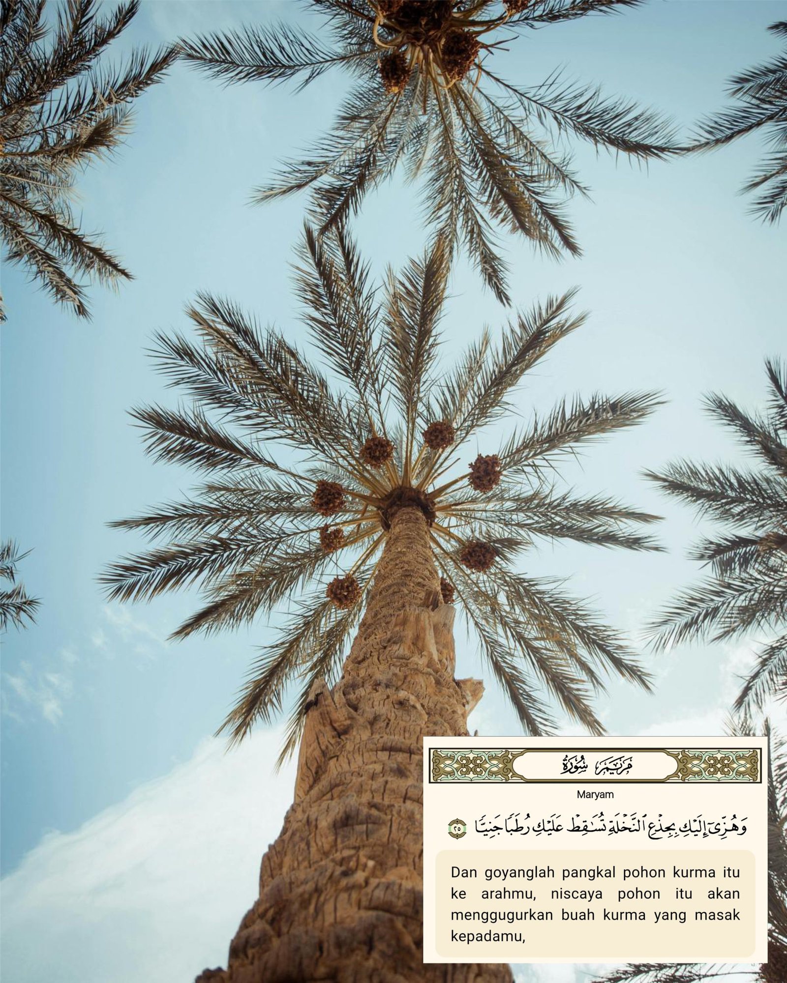 “Goyangkanlah pangkal pohon kurma itu ke arahmu, niscaya ia menjatuhkan kurma yang masak kepadamu.” (QS. Maryam [19]: 25)