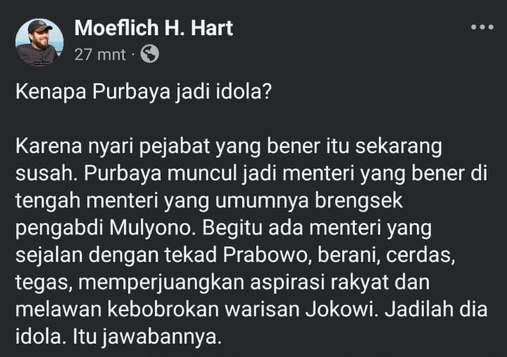 “Kenapa Purbaya jadi idola? Karena nyari pejabat yang bener itu sekarang susah. Purbaya muncul jadi menteri yang bener di tengah menteri yang umumnya brengsek pengabdi Mulyono. Begitu ada menteri yang sejalan dengan tekad Prabowo, berani, cerdas, tegas, memperjuangkan aspirasi rakyat dan melawan kebobrokan warisan Jokowi. Jadilah dia idola. Itu jawabannya,” ujar Pak Moeflich.