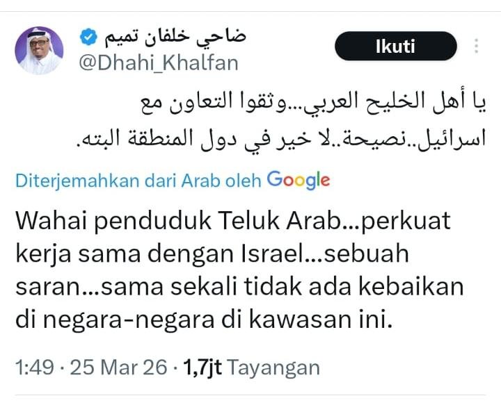 “Wahai penduduk Teluk Arab…perkuat kerja sama dengan Israel…sebuah saran…sama sekali tidak ada kebaikan di negara-negara di kawasan ini,” kata Letjen Dhahi Khalfan Tamim ضاحي خلفان تميم @Dhahi_Khalfan, Rabu (25 Maret 2026).