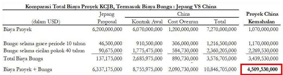Dengan profil proyek seperti di atas, akhirnya China dimenangkan, meskipun secara total, termasuk biaya bunga, biaya proyek China ini jauh lebih mahal dari Jepang. Lihat tabel.