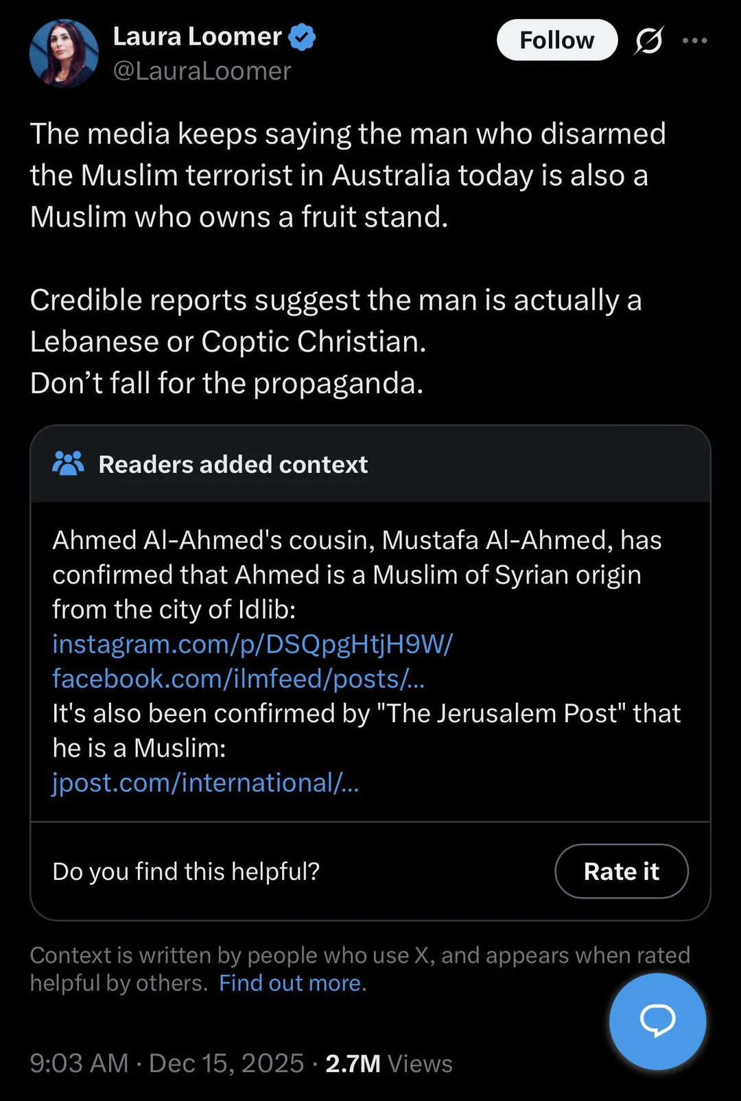 Hampir seketika, sebagian dari internet sayap kanan mulai bekerja untuk menghapus kenyataan itu. Para influencer dan komentator yang menyukai narasi Islamofobia mulai bersikeras, tanpa bukti, bahwa Ahmed pasti seorang Kristen. Laura Loomer, salah satu pendukung Trump, menulis di X: “Laporan yang kredibel menunjukkan bahwa pria itu sebenarnya adalah seorang Kristen Lebanon atau Koptik. Jangan tertipu oleh propaganda.”