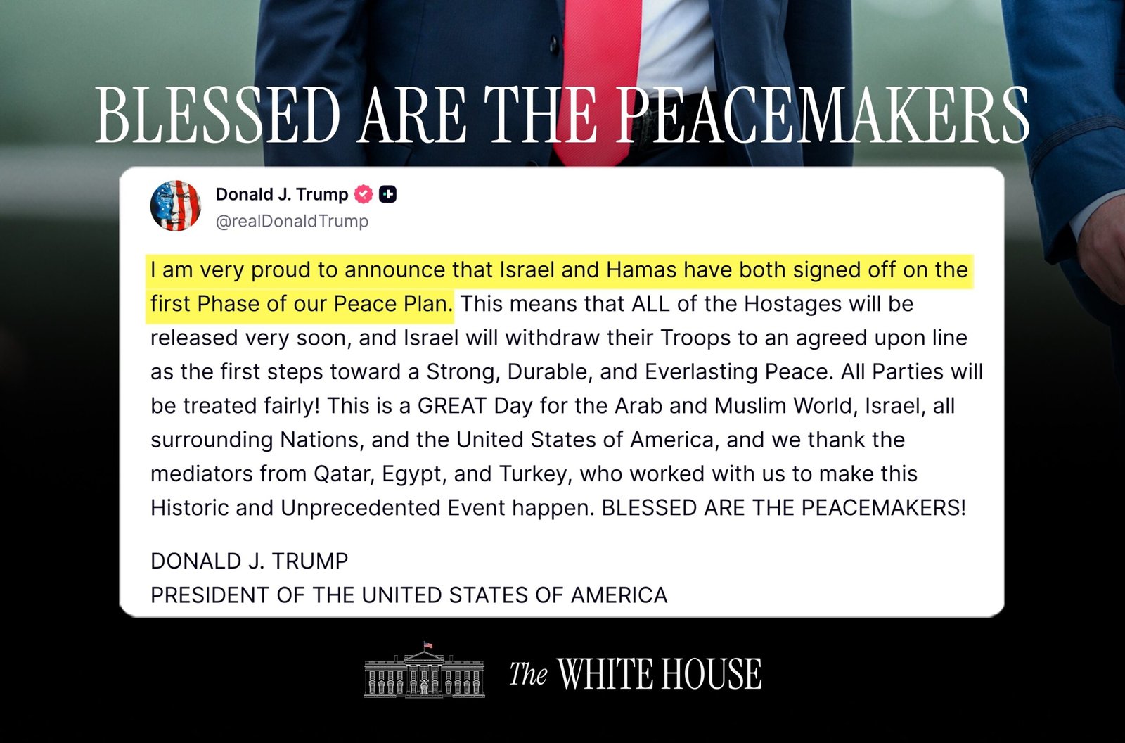Di saat bersamaan, Donald Trump di akun pribadinya di Truth Social @realDonaldTrump dengan bangga menyebut Israel dan Hamas telah bersepakat tandatangani fase 1 rencana damai. Selamat, tapi jangan buru-buru optimis. Jalan masih berliku dan ingat kebiasaan Israel yang suka bermanuver ingkar janji.