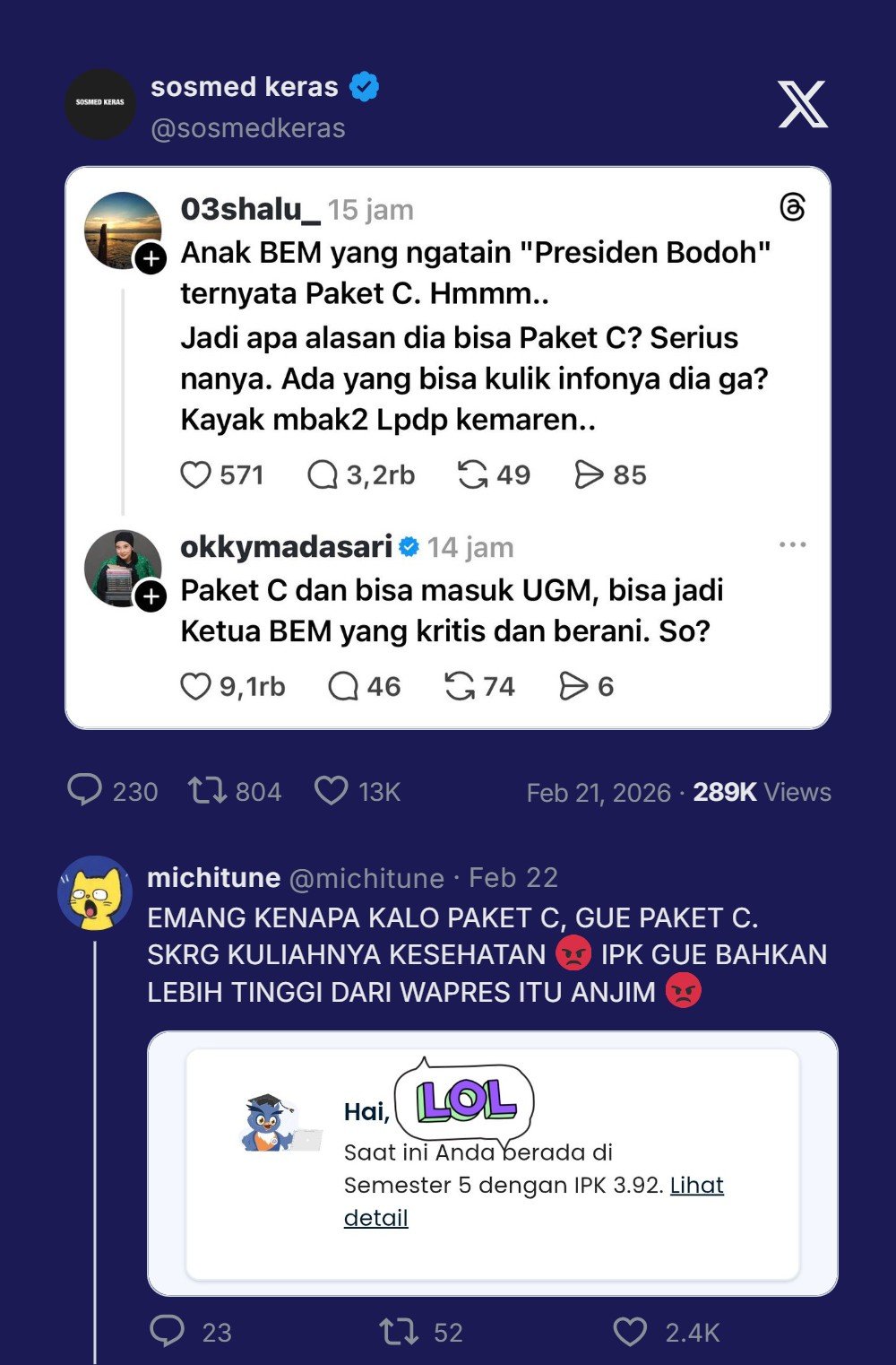 “EMANG KENAPA KALO PAKET C, GUE PAKET C. SKRG KULIAHNYA KESEHATAN 😡 IPK GUE BAHKAN LEBIH TINGGI DARI WAPRES ITU ANJIM 😡,” komen netizen X.