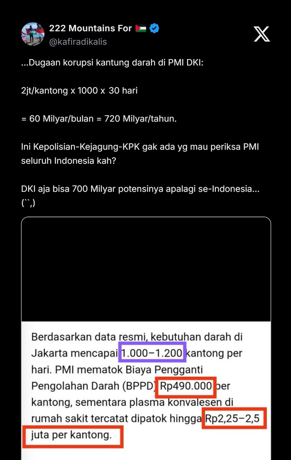 Berdasarkan data resmi, kebutuhan darah di Jakarta mencapai 1.000–1.200 kantong per hari. PMI mematok Biaya Pengganti Pengolahan Darah (BPPD) Rp490.000 per kantong, sementara plasma konvalesen di rumah sakit tercatat dipatok hingga Rp2,25–2,5 juta per kantong.