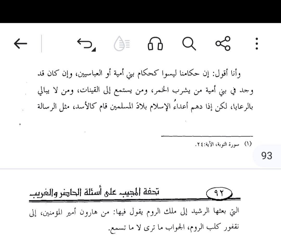 Dan saya nyatakan: Sesungguhnya para penguasa kita bukanlah seperti para penguasa Bani Umayyah atau Bani Abbasiyah. Meskipun dahulu ada pada Bani Umayyah terdapat penguasa yang meminum khamr, ada yang mendengarkan nyanyian, dan ada yang tidak memperdulikan urusan rakyat. Namun apabila musuh-musuh Islam menyerang negeri kaum muslimin, mereka akan bangkit bak singa (untuk membelanya seperti surat yang dikirim oleh Khalifah Harun Ar-Rasyid kepada kaisar Romawi (yang bernama Nakfur-pent), beliau berkata dalam surat tersebut: