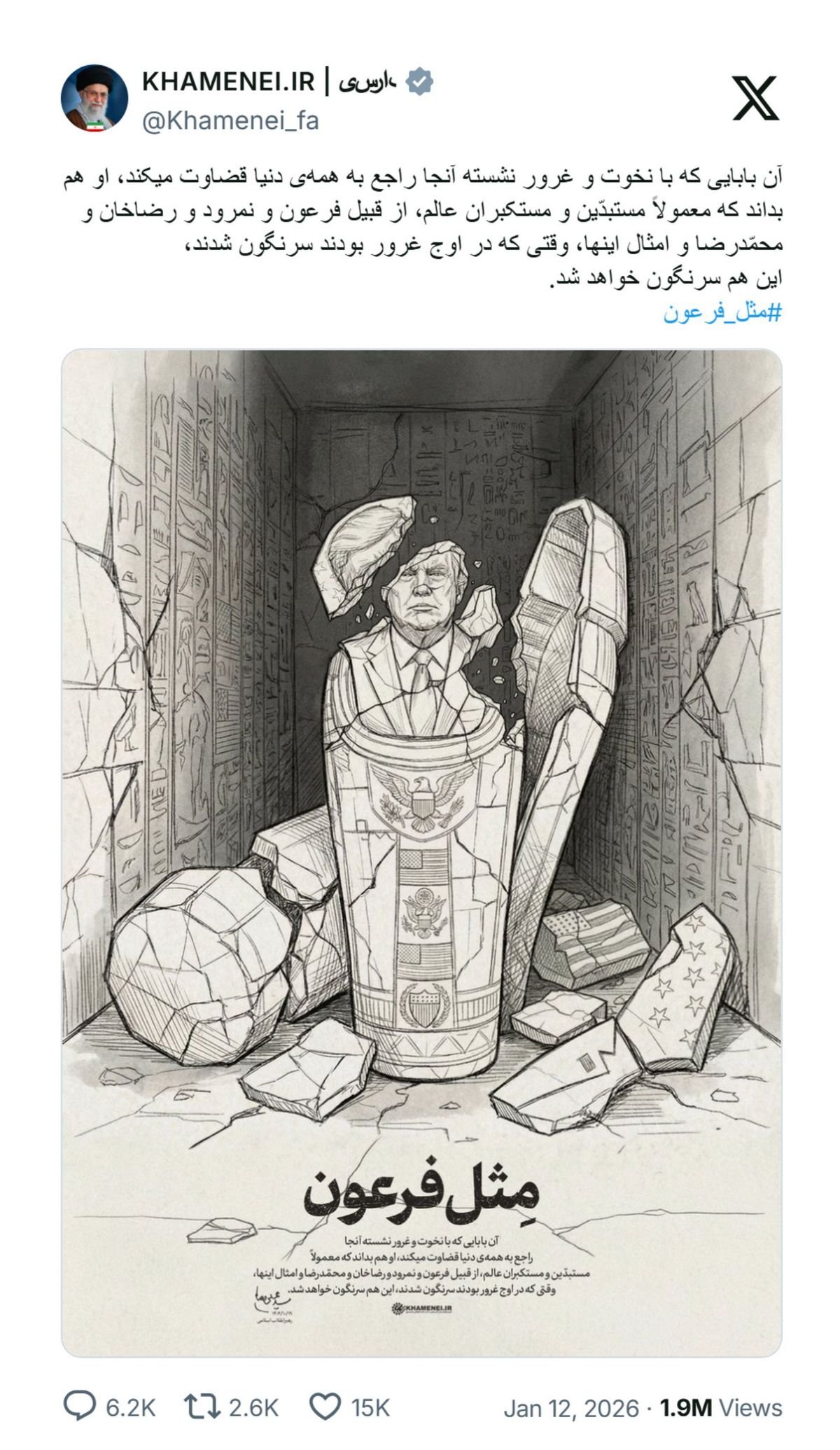 Pemimpin Tertinggi Iran Ayatollah Ali Khamenei mengunggah sebuah ilustrasi yang menggambarkan Presiden Amerika Serikat Donald Trump sebagai Firaun.