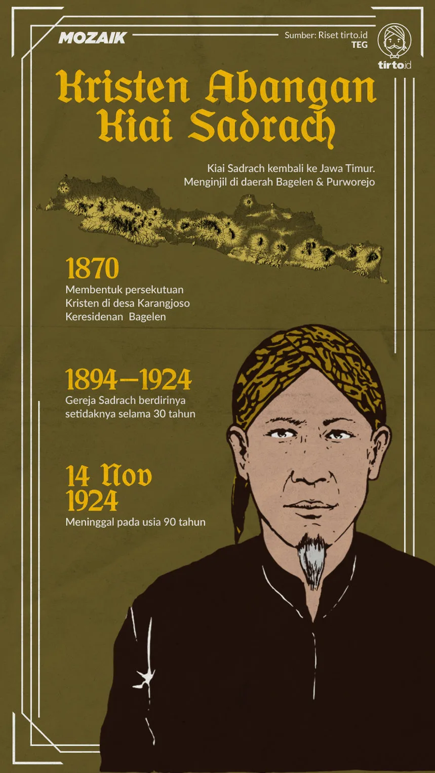 Kiai Sadrach, seorang penginjil pribumi Jawa yang menggabungkan unsur budaya Jawa dengan ajaran Kristen. Kiai Sadrach mengabdikan sisa hidupnya di Purworejo hingga meninggal di sana pada usia sekitar 89-90 tahun. Ia dikenal sebagai tokoh penyebar ajaran Kristen di tanah Jawa dengan cara yang unik dan berbeda, yaitu dengan memasukkan elemen budaya Jawa ke dalam praktik keagamaannya.