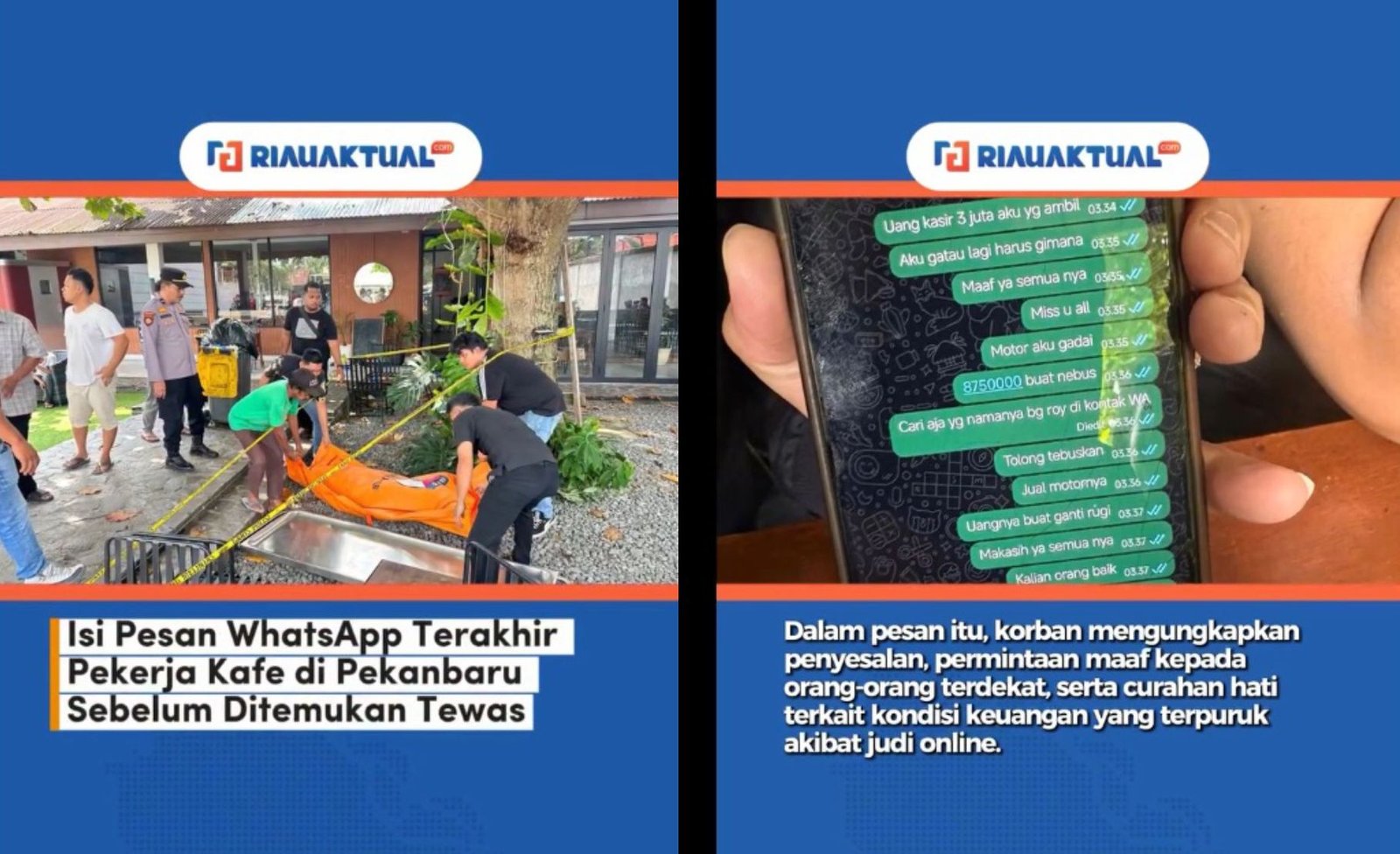“Jangan judi ya… semuanya karena judi,” tulis korban dalam pesannya.