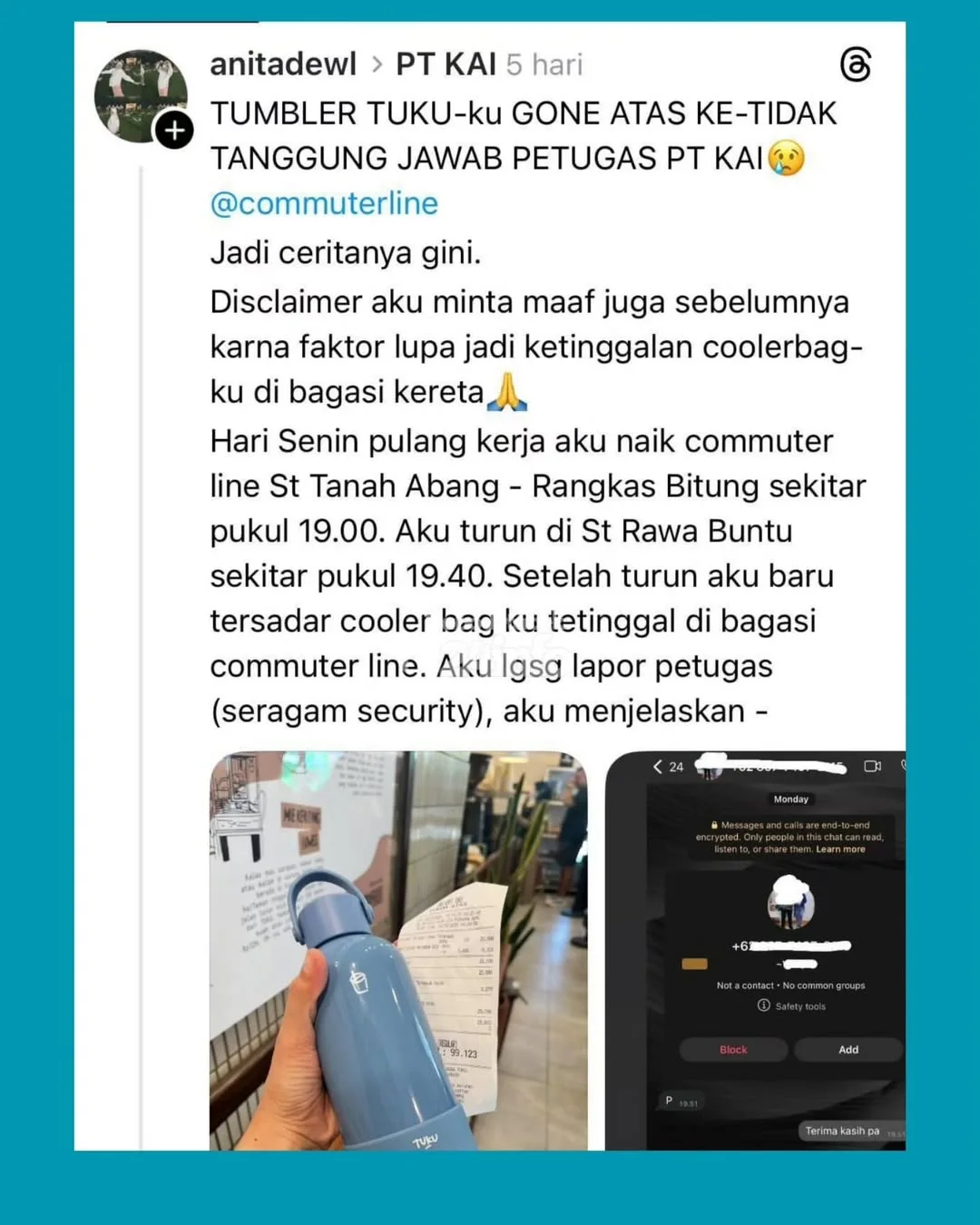 Sekitar 19.40 WIB, Anita turun di Stasiun Rawa Buntu. Di tengah keramaian penumpang, ia baru sadar cooler bag yang harusnya digenggam malah masih duduk nyaman di gerbong. Panik tentu saja. Tapi hidup sedang baik, karena petugas KRL menemukan tas itu. Mereka memotretnya sebagai bukti bahwa isi tas masih lengkap dan tumblernya masih anteng di dalam.
