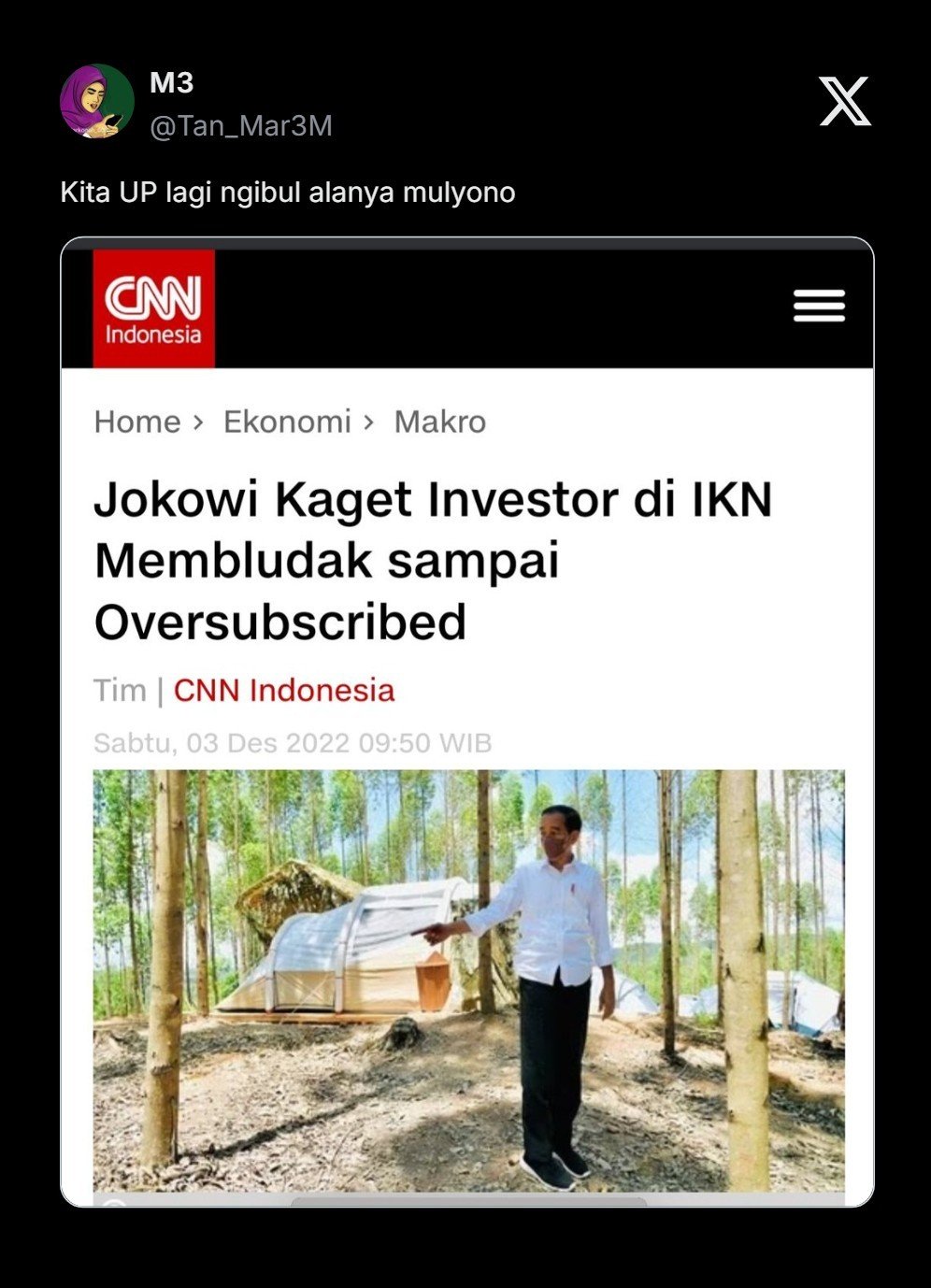 Efeknya, baru-baru ini Presiden Joko Widodo mengklaim investasi di IKN over-subscribed atau kelebihan kapasitas. Dia bahkan mengaku terkejut karena investor ini jumlahnya meningkat hingga 25 kali lipat.