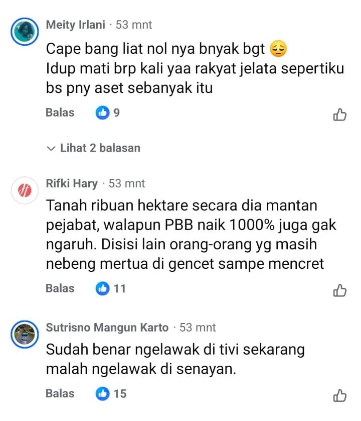 Maka, dengan properti sebanyak ini, elu bilang ngontrak di pinggiran Jakarta, bla bla, bingung maksudnya. Elu jatuh miskin atau bagaimana? Ayolah, hal2 begini dikurangi dikit. Kenapa sih rakyat ngamuk kemarin, karena ucapan kalian, tingkah kalian.