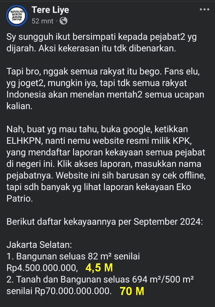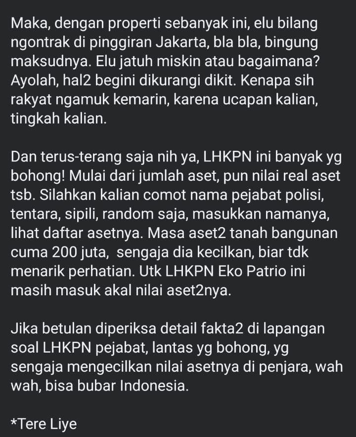 Dan terus-terang saja nih ya, LHKPN ini banyak yg bohong! Mulai dari jumlah aset, pun nilai real aset tsb. Silahkan kalian comot nama pejabat polisi, tentara, sipili, random saja, masukkan namanya, lihat daftar asetnya. Masa aset2 tanah bangunan cuma 200 juta, sengaja dia kecilkan, biar tdk menarik perhatian. Utk LHKPN Eko Patrio ini masih masuk akal nilai aset2nya.
