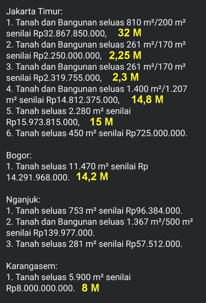 - Tanah seluas 5.900 m² senilai Rp8.000.000.000.