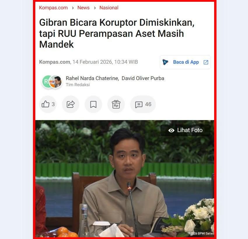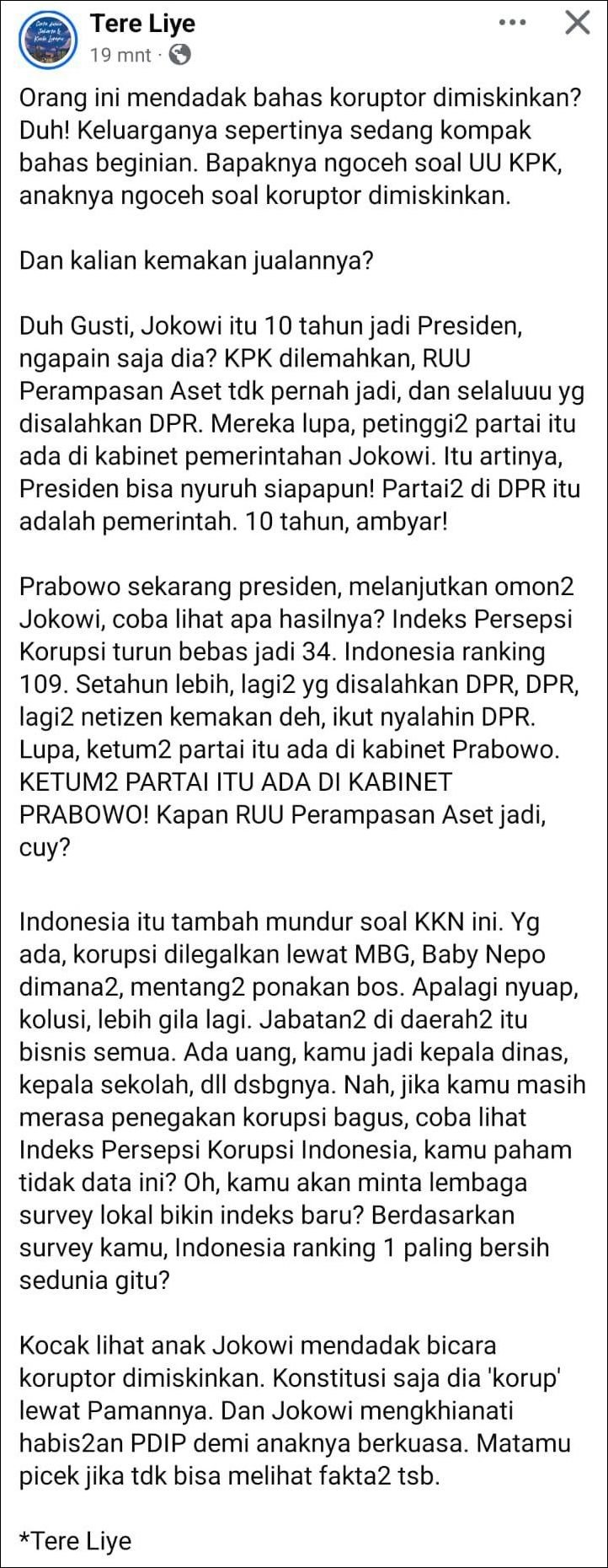 Prabowo sekarang presiden, melanjutkan omon2 Jokowi, coba lihat apa hasilnya? Indeks Persepsi Korupsi turun bebas jadi 34. Indonesia ranking 109. Setahun lebih, lagi2 yg disalahkan DPR, DPR, lagi2 netizen kemakan deh, ikut nyalahin DPR. Lupa, ketum2 partai itu ada di kabinet Prabowo. KETUM2 PARTAI ITU ADA DI KABINET PRABOWO! Kapan RUU Perampasan Aset jadi, cuy?