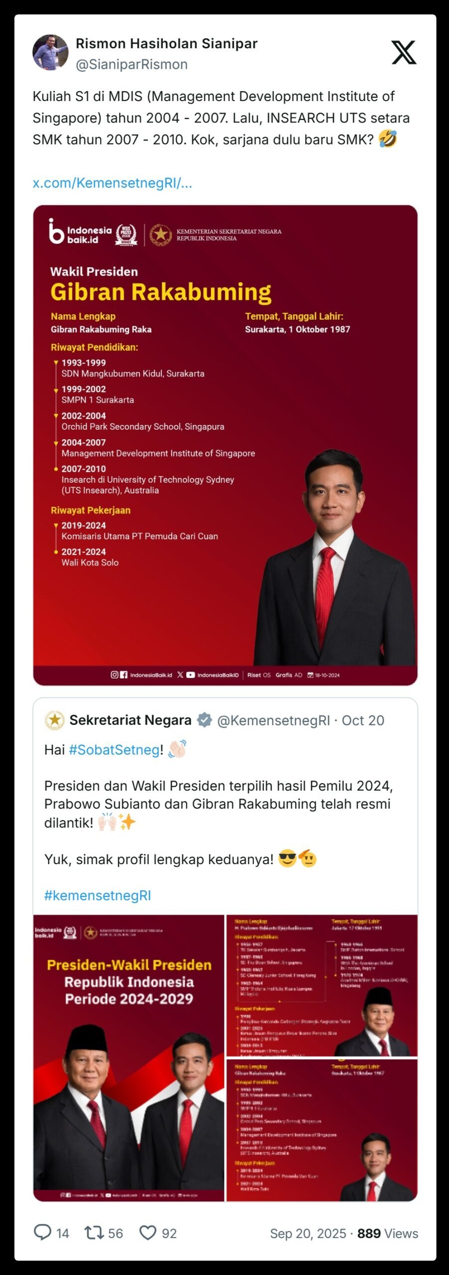 - Data yang diposting akun resmi Sekretariat Negara tentang Riwayat Pendidikan Gibran, disitu ditulis Gibran sekolah di MDIS tahun 2004-2007, kemudian Gibran sekolah di UTS Insearch Australia tahun 2007-2010.