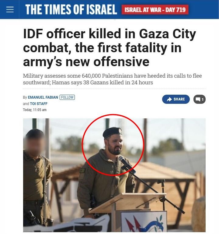 👉IDF officer killed in Gaza City combat, the first fatality in army’s new offensive